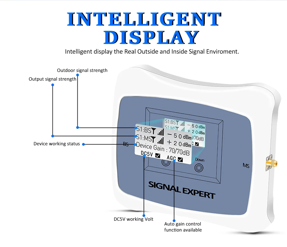 1, умный, чтобы направлять установку с ЖК-дисплеем.2. В режиме реального времени отображается сила сигнала.3. Автоматический режим ожидания, когда пользователь не делает вызов.4. Автоматическая сигнализация при ошибке установки и предоставление соответствующего решения.5. Автоматическая регулировка коэффициента усиления системы, чтобы избежать самовозбуждения повторителя.6. Напоминаем о том, когда устройство было повреждено.