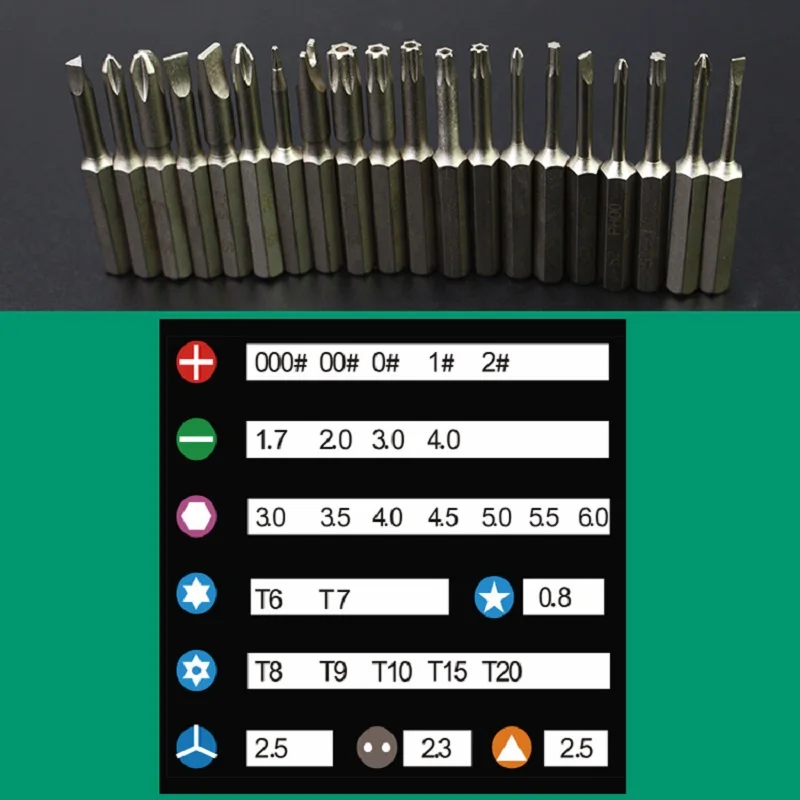 Содержит 20 штук обычного размера S2 бит, 7 шт. гнездо бит, 1 шт. удлиненный стержень и 1 шт. удлиненный шестигранный бит, используемый для различных рабочих зон. Совершенно новая пластиковая коробка, устойчивость к падению. Функция сложения, простота в использовании.