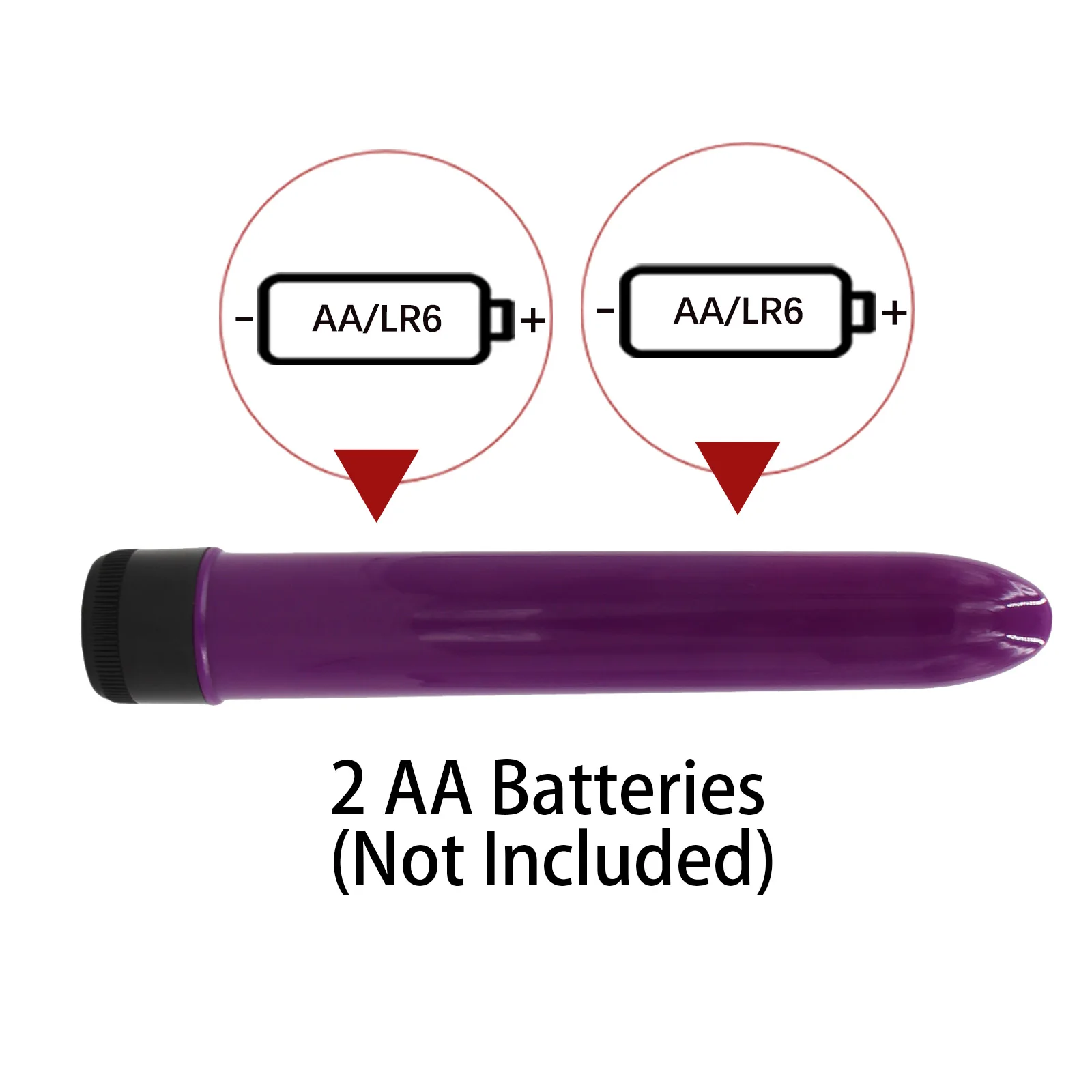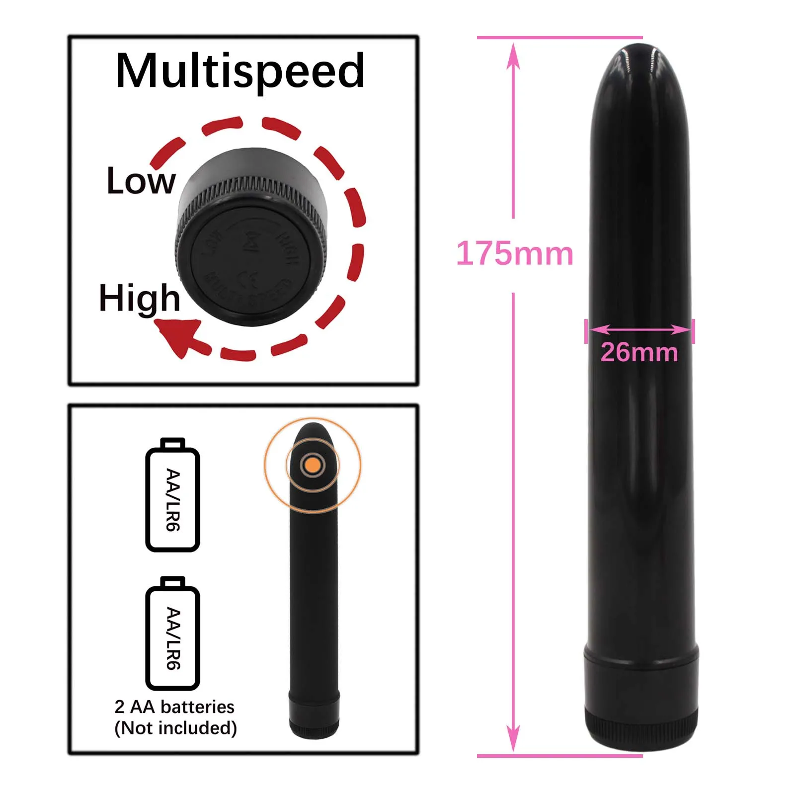 Размер: длина 175 * диаметр 26 ммЦвет: черный, фиолетовый, розовый, синийИсточник питания: 2 батарейки АА (не входят в комплект)Функция: многоскоростная вибрация, мощный, водонепроницаемый, гладкая поверхность