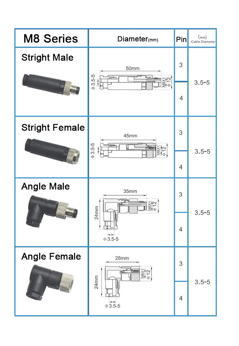 Разъем датчика M8, водонепроницаемый штекер и гнездо, прямой угол, винтовое резьбовое соединение, 3 контакта, 4 контакта