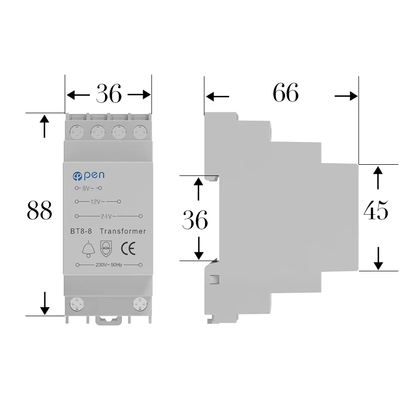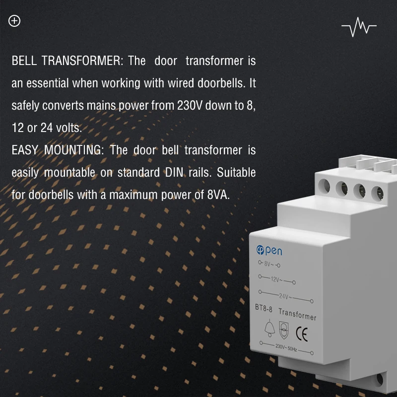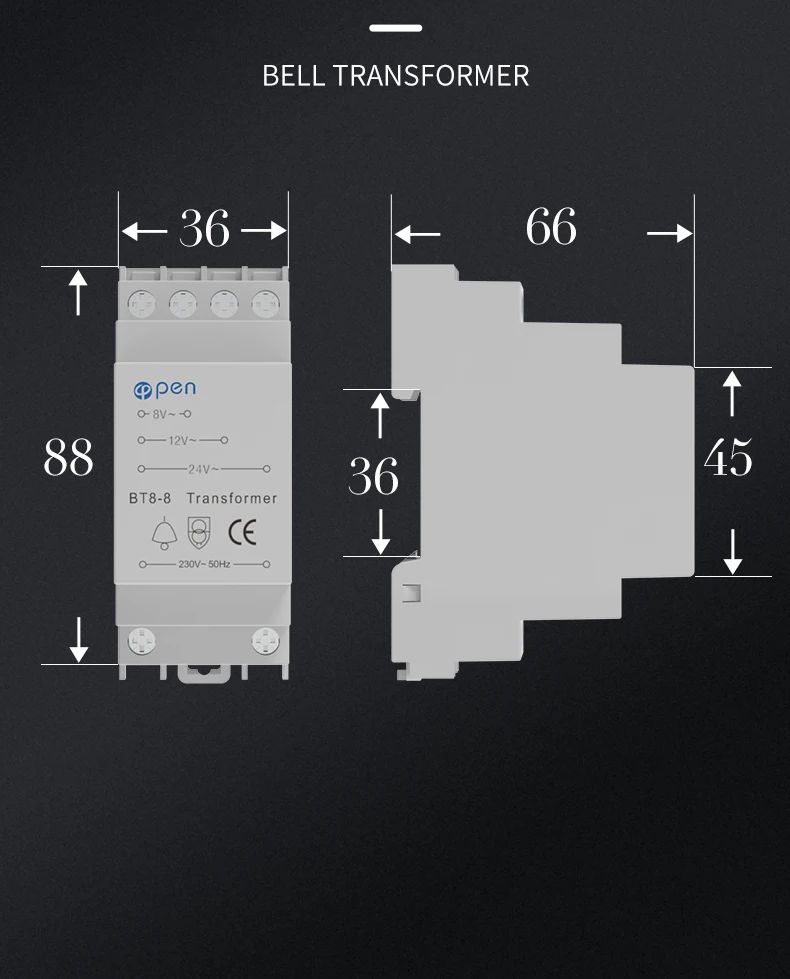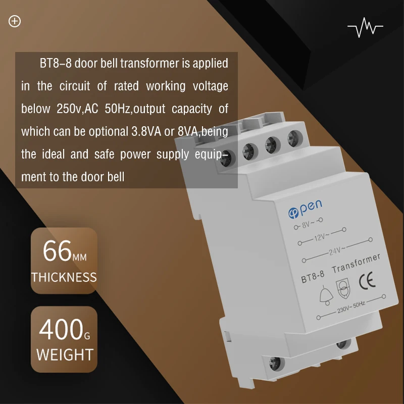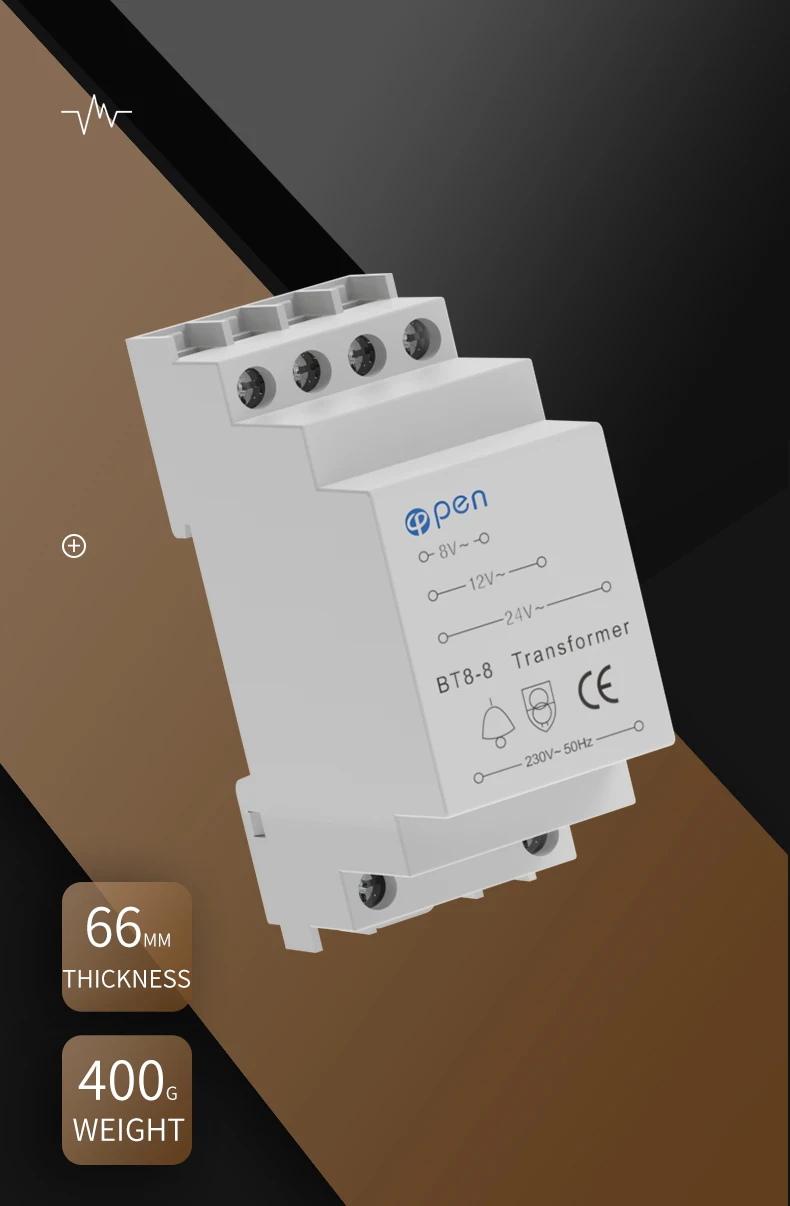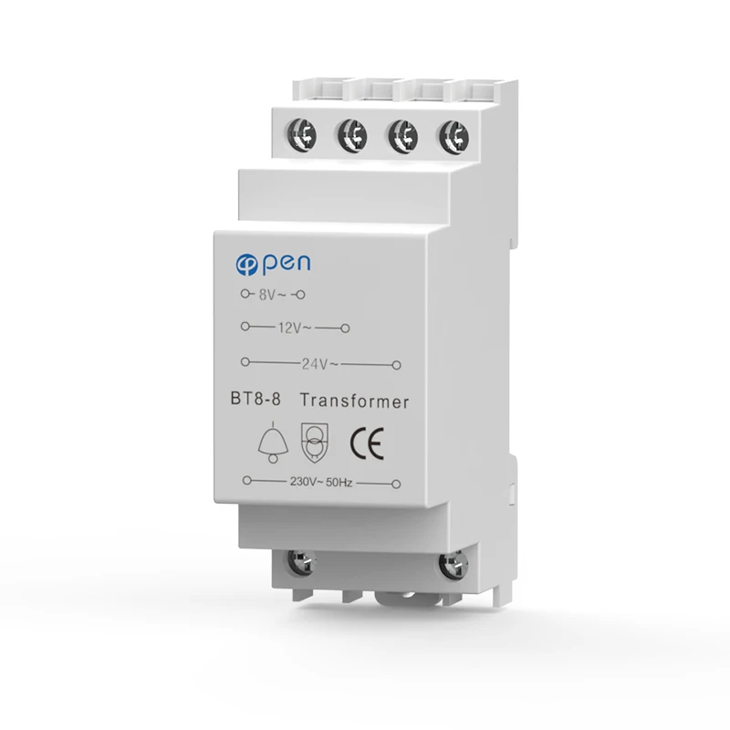 Трансформатор дверного звонка, BT8-8, номинальное напряжение, 230 В переменного тока, 5060 Гц, IP20, сертификация CE, направляющего типа, защита дверного звонка