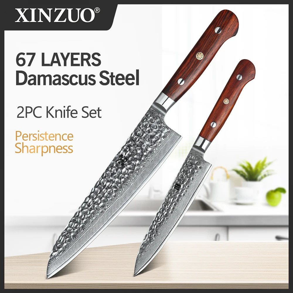 Набор кухонных ножей XINZUO, комплект шеф-повара из дамасской кованой стали, универсальный нож сантоку, ручка из розовой нержавеющей стали, 2 шт.