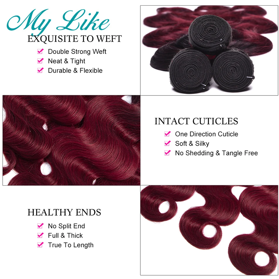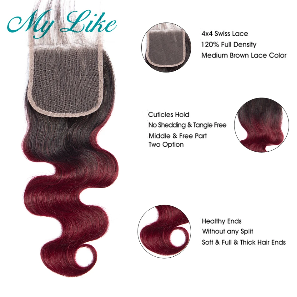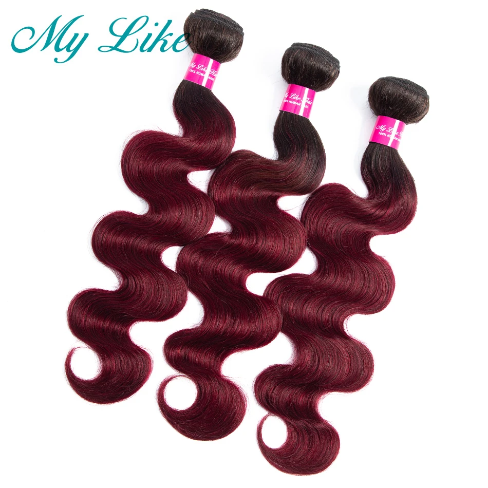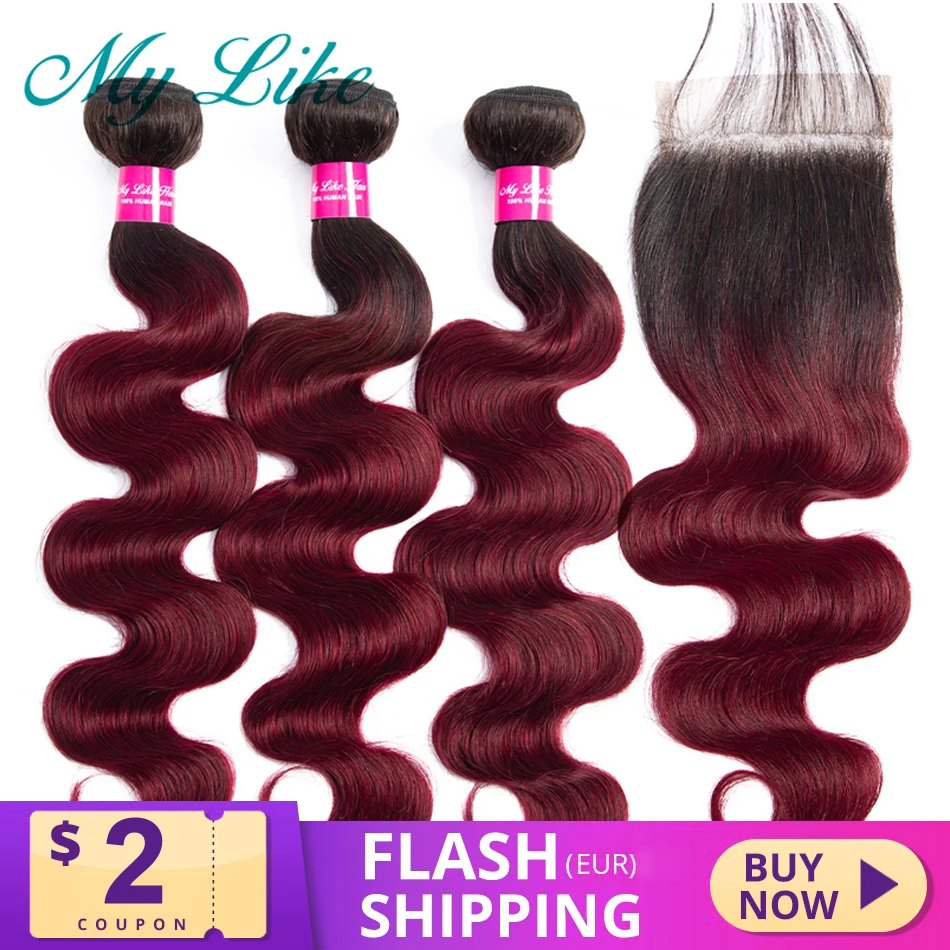 My Like Омбре пучки с закрытием 1b/99j бордовый красный человеческие волосы объемные волнистые пучки с закрытием не Реми бразильские волосы плетение