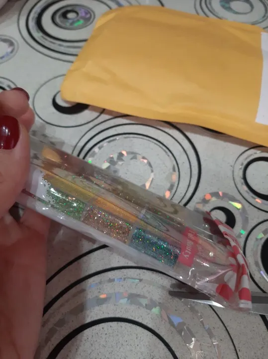 Заказ шёл больше 2 мес. Красивые блёстки. Заказ привёз курьер. Продавец положил подарок кисточку. Спасибо)