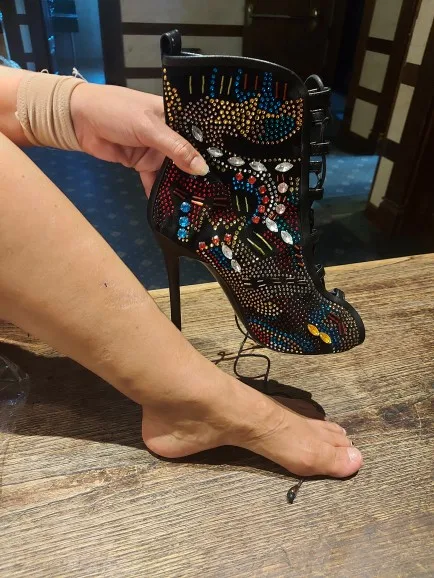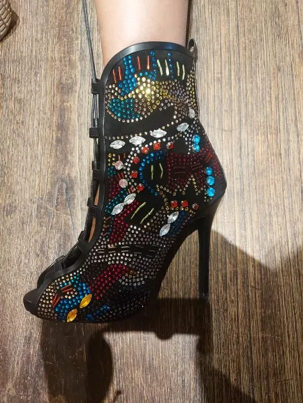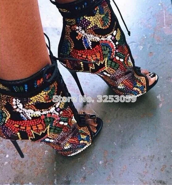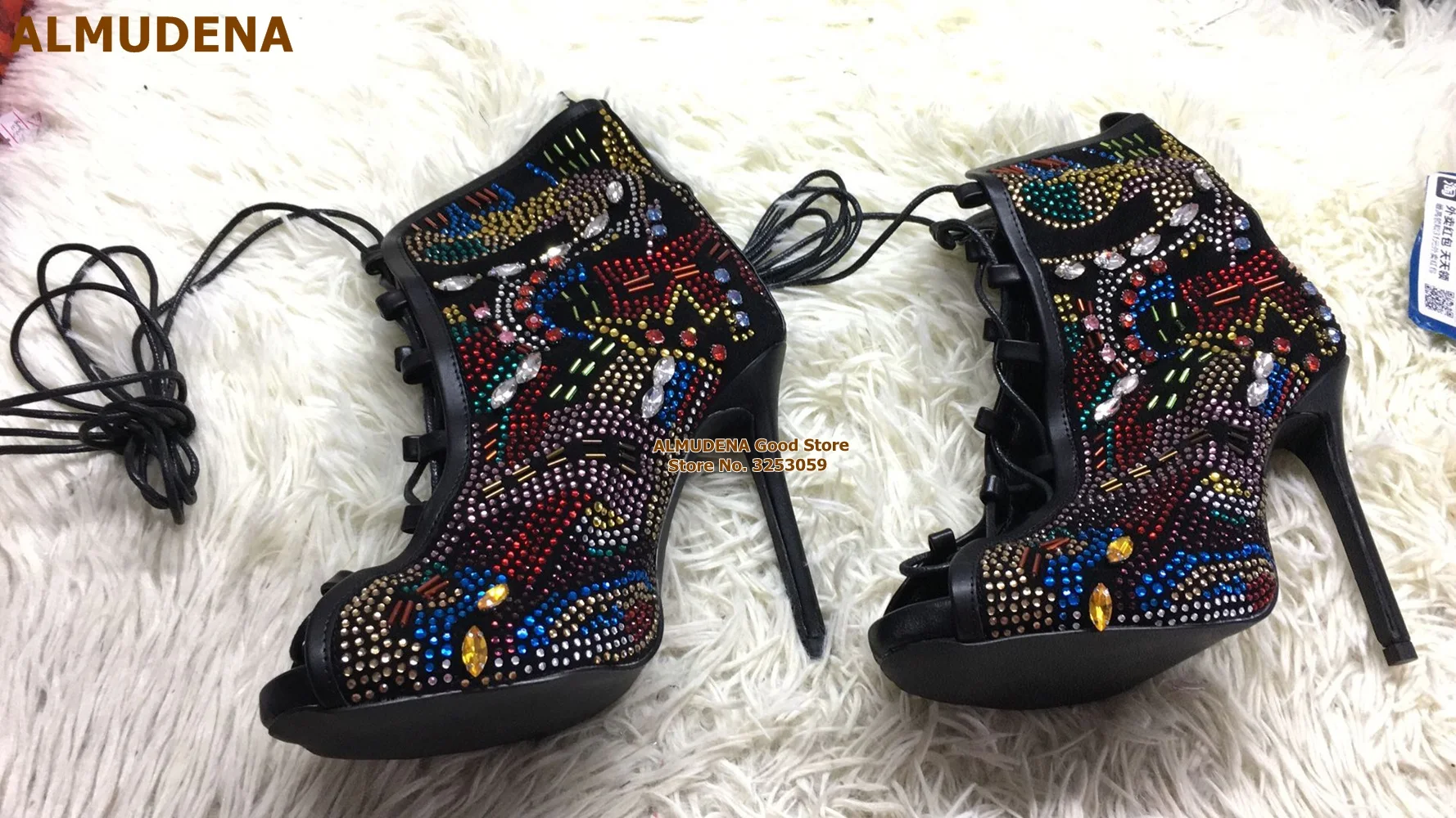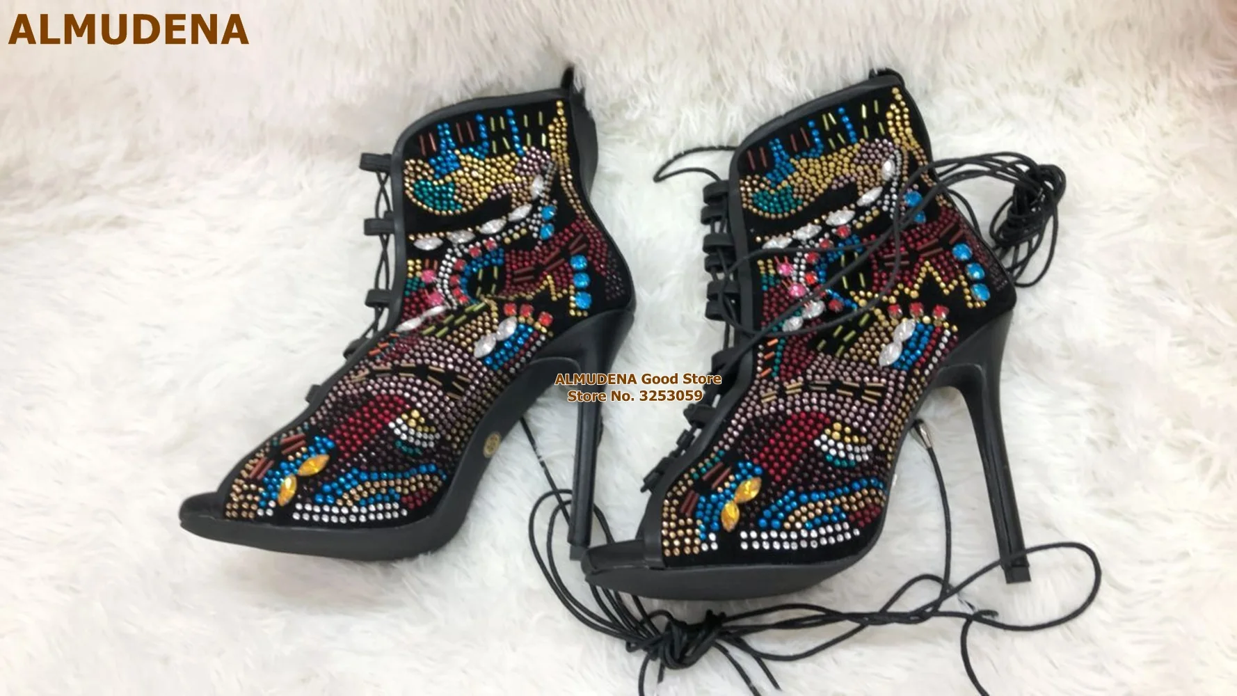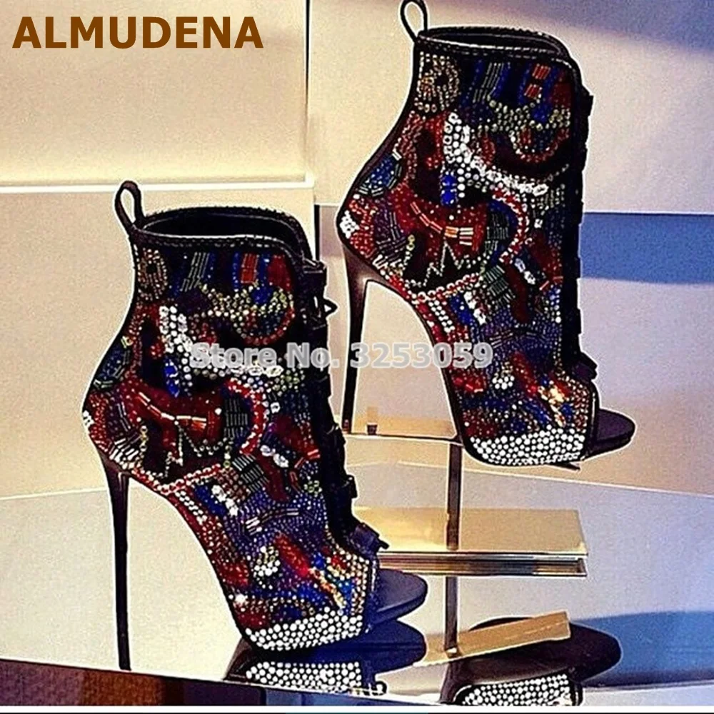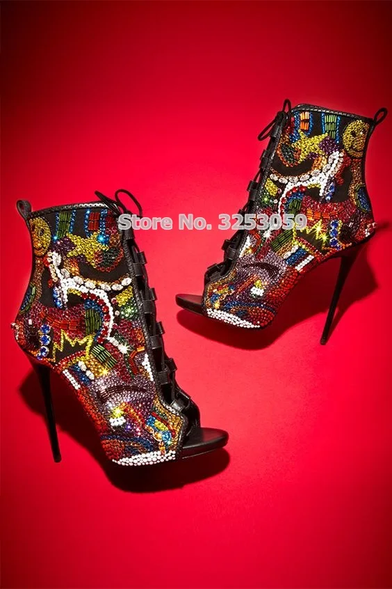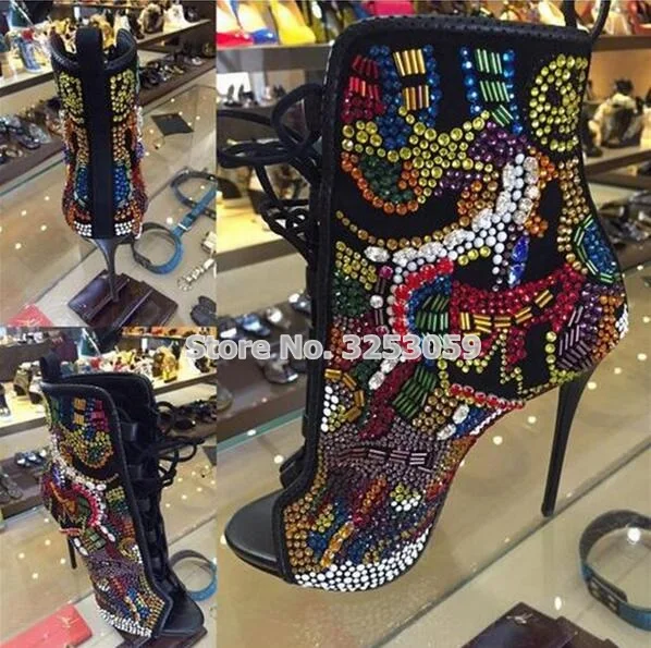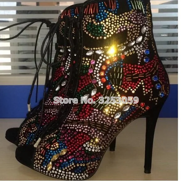 Ботинки женские разноцветные, на шнуровке, с открытым носком, стразы, украшенные кристаллами ботильоны, свадебные туфли, на очень высоких каблуках