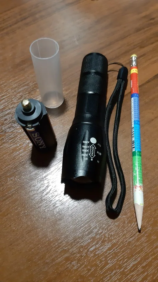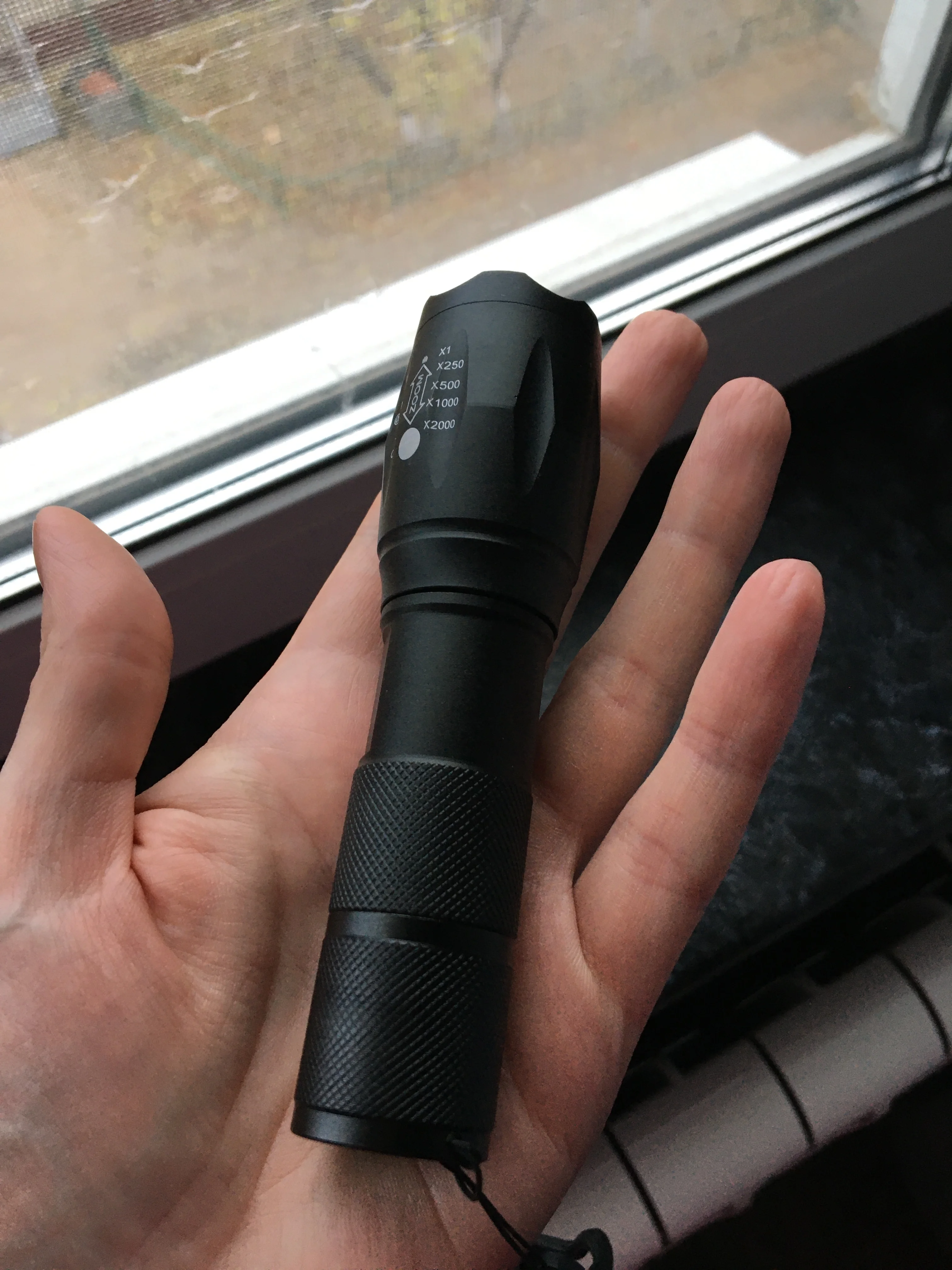 Фонарик добротный, светит ярко (не 8000 люмен конечно), корпус металлический, но вот кнопка - хлипкий силикон видно, думаю быстро порвётся. Из плохого, то что линза пришла поцарапанная и вставлена без какого нибудь уплотнителя и болтается в корпусе.