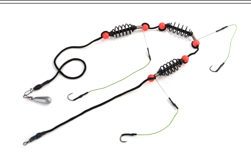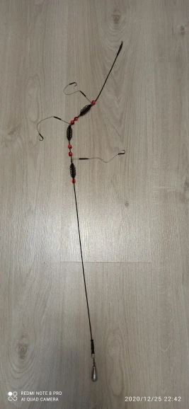 вся снасть собрана на какой-то тянущейся дешёвой верёвке, надеюсь выдержит. искусственное натяжение рукой выдерживает. крючки острые, груз маловат, добавлю свой. последнее фото после растягивания и проверки натяжения, снасть значительно увеличилась по длине.