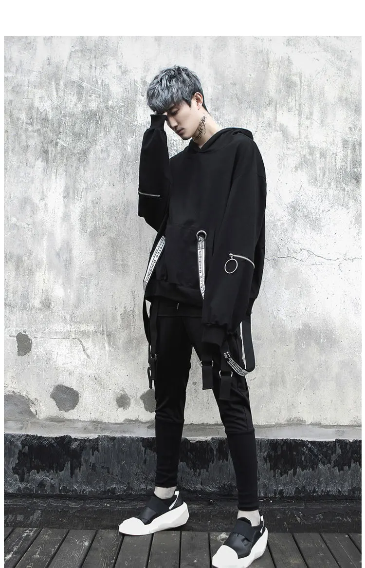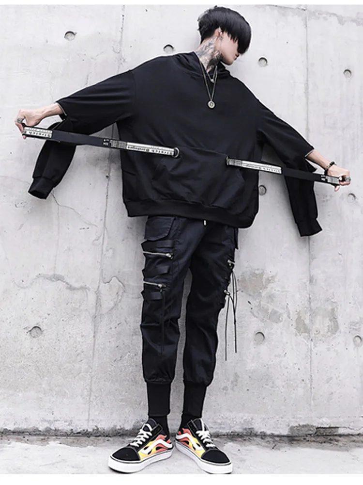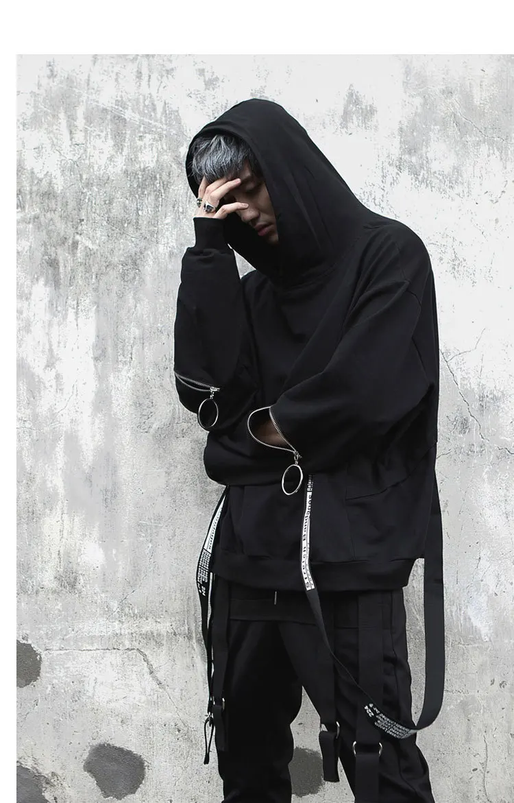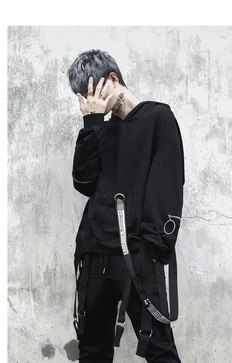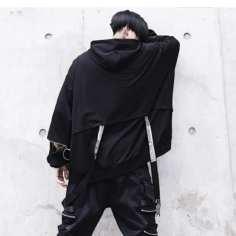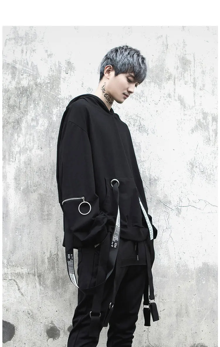 Уличная Толстовка в стиле хип-хоп, Мужская модная повседневная свободная толстовка с капюшоном, Мужской пуловер на молнии с длинным рукавом и лентами, свитшот, пальто