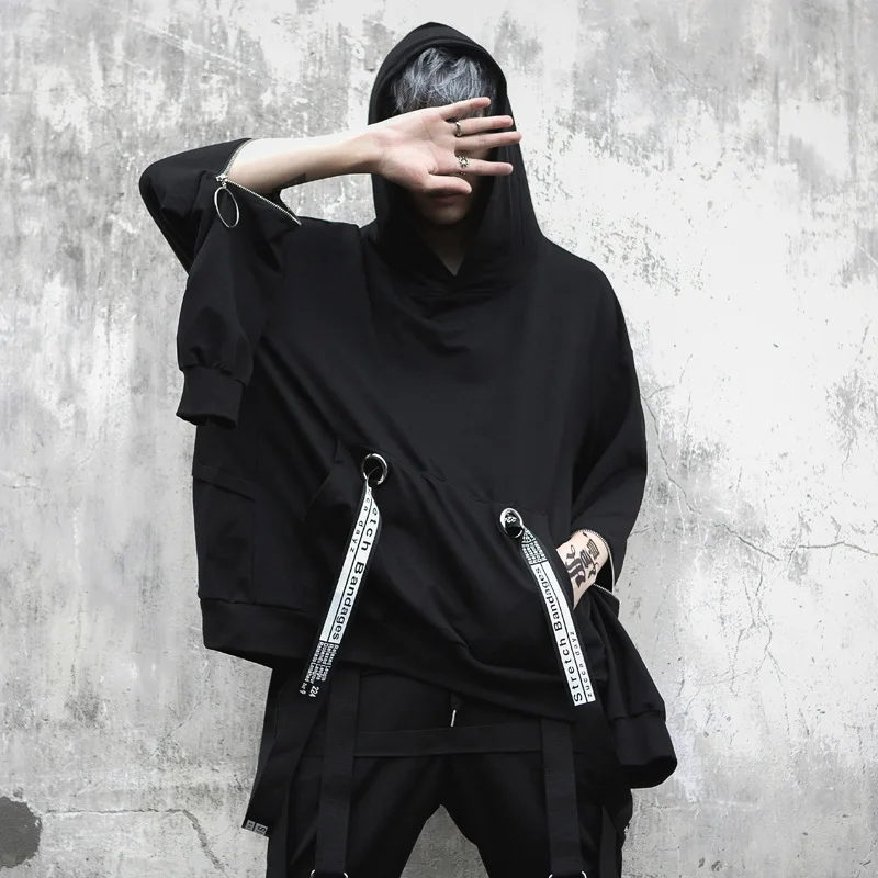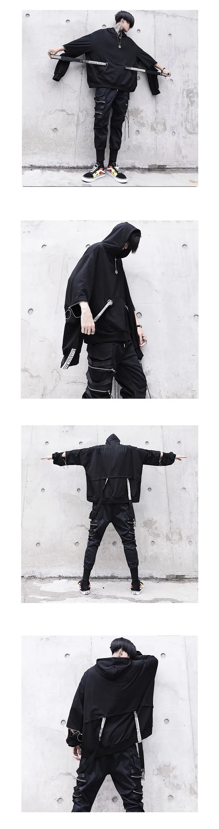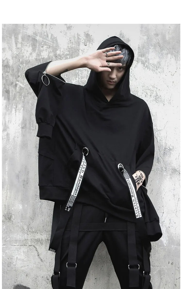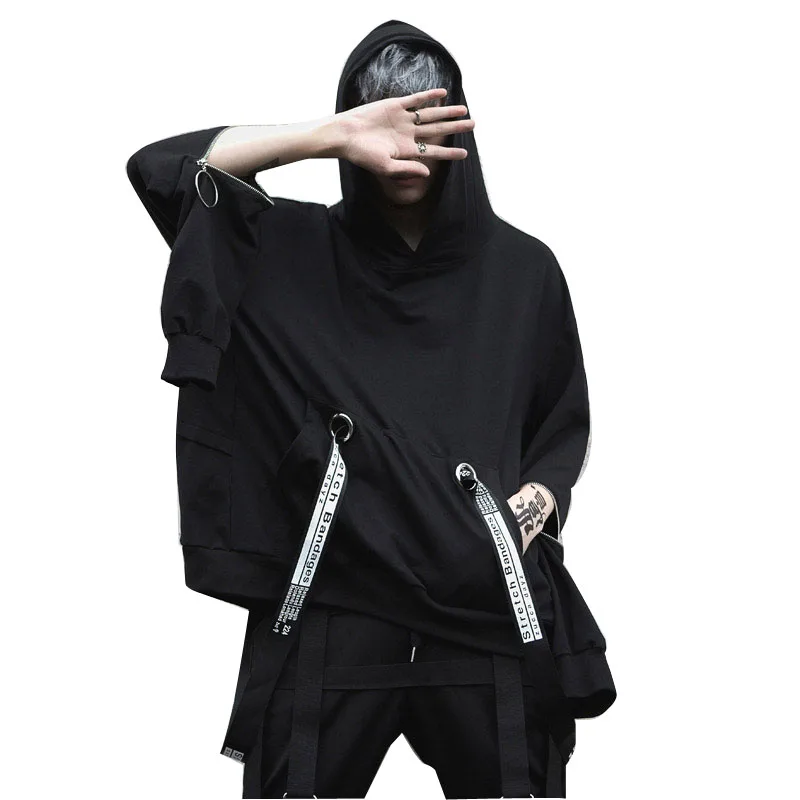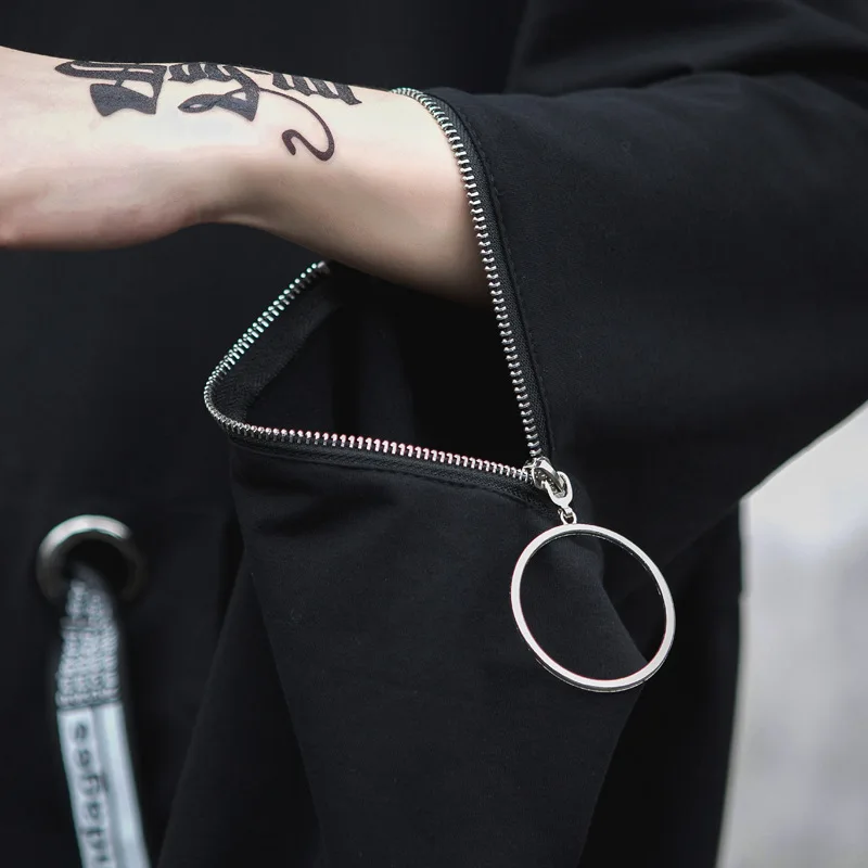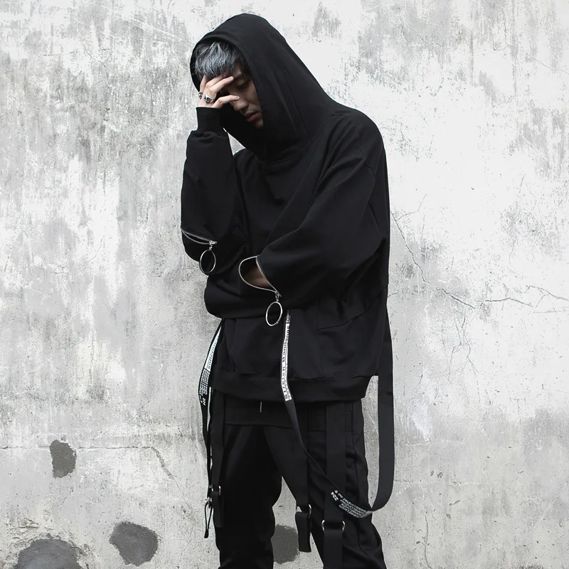 Уличная Толстовка в стиле хип-хоп, Мужская модная повседневная свободная толстовка с капюшоном, Мужской пуловер на молнии с длинным рукавом и лентами, свитшот, пальто