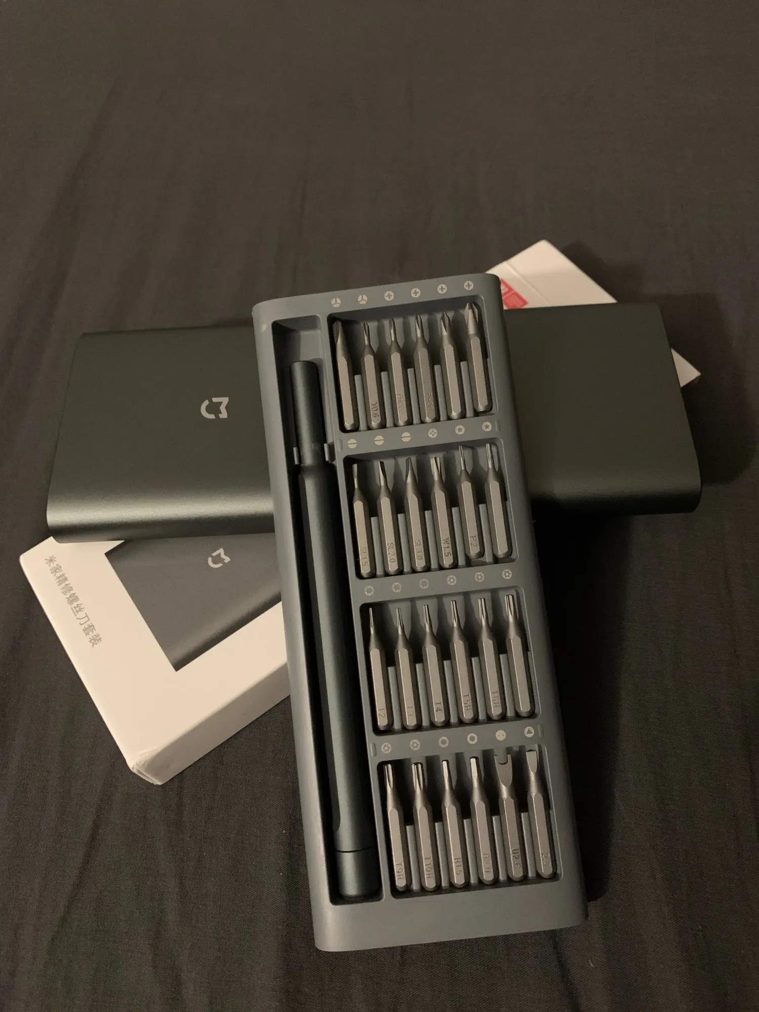 Сяоми, как всегда на высоте, гнëзда под биты магнитные, гнездо в ручке, тоже магнитное, коробочка симпатичная и удобная, коврик для болтиков, так же подмагничен. в очень удобно.