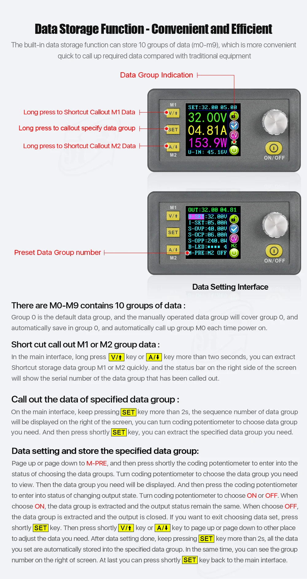 Страница вверх или вниз до M-PRE, а затем вскоре нажмите потенциометр кодирования, чтобы войти в состояние выбора групп данных. Поверните потенциометр кодирования, чтобы выбрать группу данных, которую вы хотите просмотреть. Затем отобразится нужная вам группа данных. А затем нажмите потенциометр кодирования, чтобы войти в состояние изменения выходного состояния. Поверните потенциометр кодирования, чтобы выбрать вкл. Или ВЫКЛ. При выборе ON извлекается группа данных, а выходное состояние остается прежним. При выборе OFF группа данных извлекается, и выходные данные закрыты. Если вы хотите выйти из выбора набора данных, быстро нажмите кнопку set. Затем вскоре нажмите V/✮или A/↓, чтобы перейти на страницу вверх или вниз в другое место, чтобы настроить нужные вам данные. После выполнения настройки данных продолжайте нажимать кнопку SET более 2 секунд, все данные, которые вы установили, автоматически сохраняются в указанной группе данных. В то же время вы можете увидеть номер группы справа от экрана. Наконец, вы можете быстро нажать кнопку SET back на основной интерфейс.