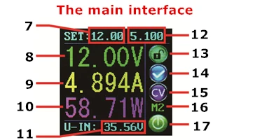 При подключении источника питания на экране сначала отображается окно приветствия, а затем появляется в основном интерфейсе. На главном интерфейсе значения выходного заданного напряжения и значения выходного заданного тока находятся в верхней части экрана. Большое значение шрифта слева-это текущее реальное выходное напряжение, текущий реальный выходной ток и текущая реальная выходная мощность. Входное напряжение находится в нижней части экрана. Справа на экране есть значки рабочего состояния, значок блокировки клавиш, значок ненормального выходного состояния, значок постоянного напряжения и постоянного тока, значок подсказки набора данных и значок открытия или закрытия выхода.