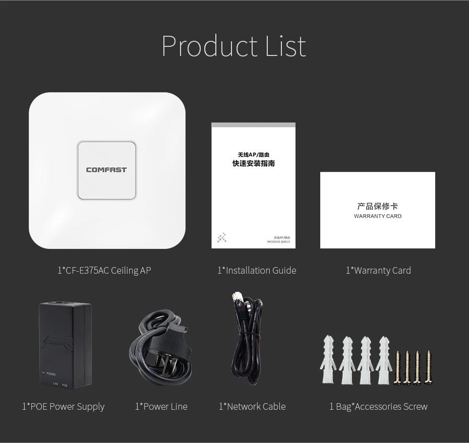 Примечание: на данный момент у CF-E375AC нет только логотипа «Comfast» на складе, хотя CF-E375AC без логотипа «COMFAST», но все они являются продукцией COMFAST. Другие параметры и функции такие же, как и маркированные CF-E375AC с логотипом "COMFAST". Вы можете использовать его с уверенностью. Поэтому после того, как вы выберете CF-E375AC, мы не вышлем логотип «CF-E375AC», надеюсь, вы сможете снять его, если у вас есть какие-либо другие вопросы, пожалуйста, сообщите нам перед заказом, спасибо