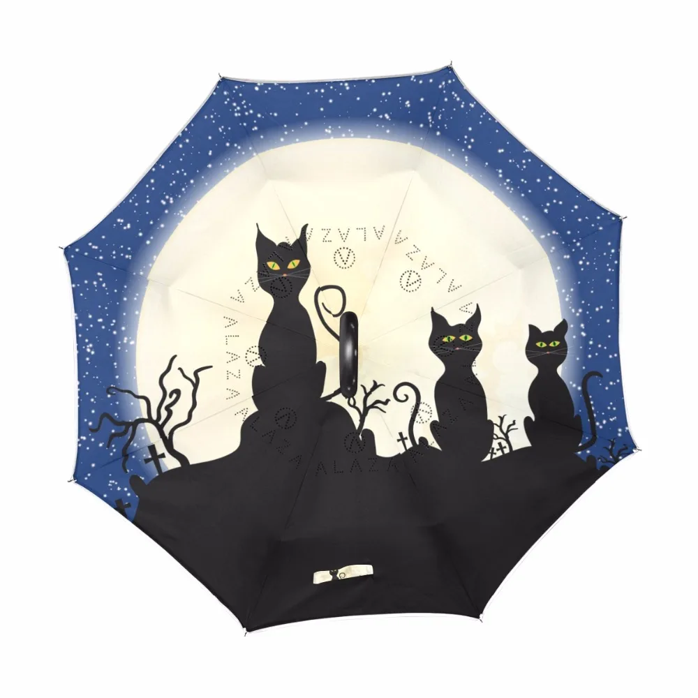 Непродуваемый обратный Зонт с изображением ночного неба, Млечного Пути, Луны, кота, мужской двухслойный перевернутый зонт для автомобиля