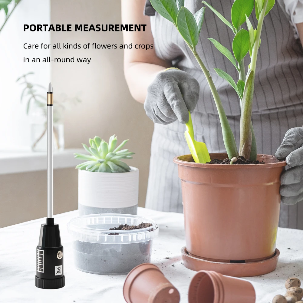 Обратите внимание:1. Металлический зонд должен быть в полном контакте с почвой и уплотнен2. При вставке электрода. Не используйте слишком большое усилие, иначе электрод будет легко поврежден3. После измерения частицы почвы на поверхности зонда должны быть своевременно очищены, а зонд должен быть сухим и храниться4. Нажмите и удерживайте кнопку переключателя режима PH/влажности