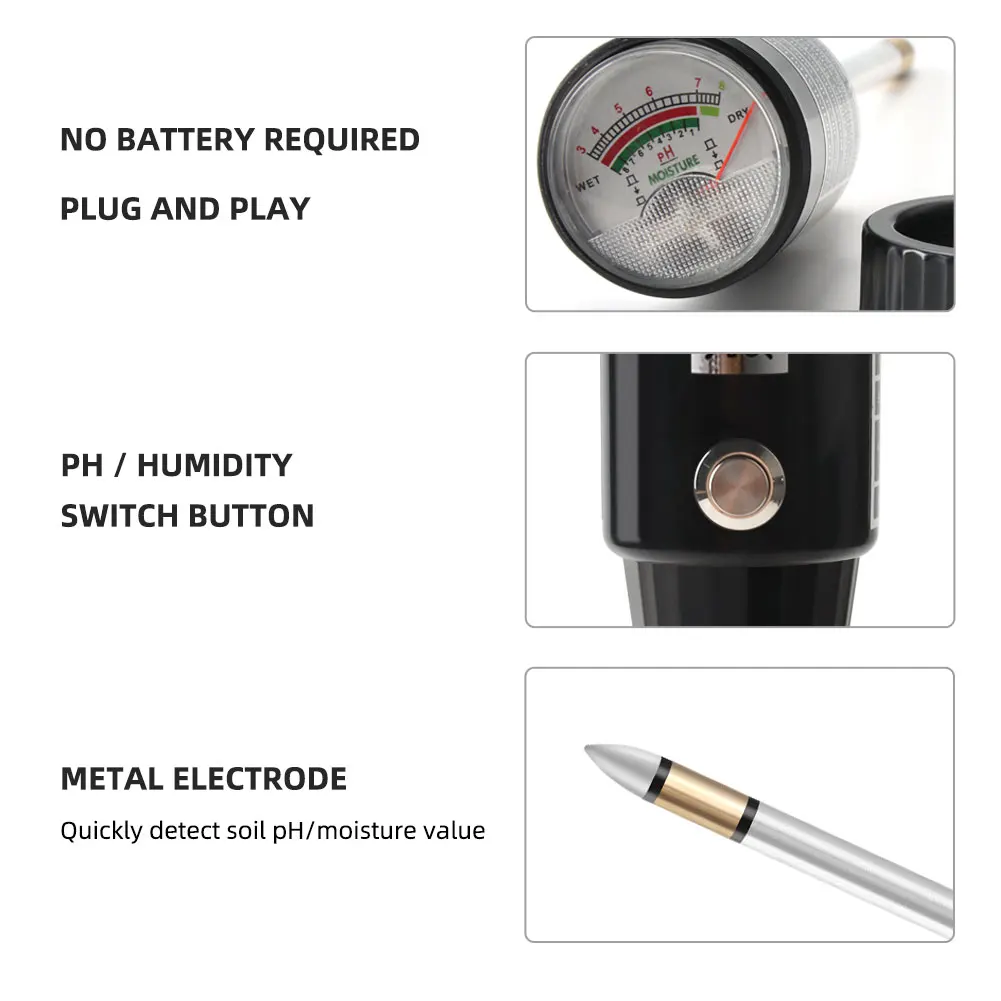 Особенности:1, надежный и долговечный2, водостойкий металлический электрод3, быстро и точно4, измерение pH и влажности различных видов почвы5, прошел строгие стандарты качества и безопасности6. Отлично подходит для быстрого определения pH и влажности виноградников, садов, полевых продуктов, саженцев, газонов, садов, растенийХарактеристики:1, диапазон измерения: 3-8 pH,1-8 влажности2, разрешение: ± 0,2 pH3, Точность: ± 0,2 pH (подходит для сельскохозяйственных и классных экспериментов)4, Рабочая температура: 5 ~ 50 °C (41 ~ 122 °F)5, Размер: около 16,3 см x 1,9 см/дюйма x дюйма6, батарея: без батареи7, Примечания: значение pH почвы является очень важным фактором для качества культур. Большинство культур не могут выжить в слишком кислотной или щелочной почве. Очень важно получить правильное чтение pH для вашего урожая