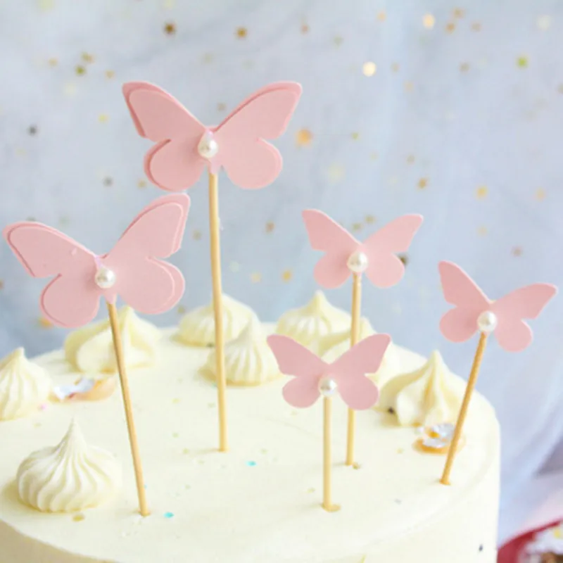 5 шт.лот, розовая бабочка с жемчугом, топперы для кексов, украшения для дня рождения, праздника для малышей, детские праздничные товары, топперы для торта