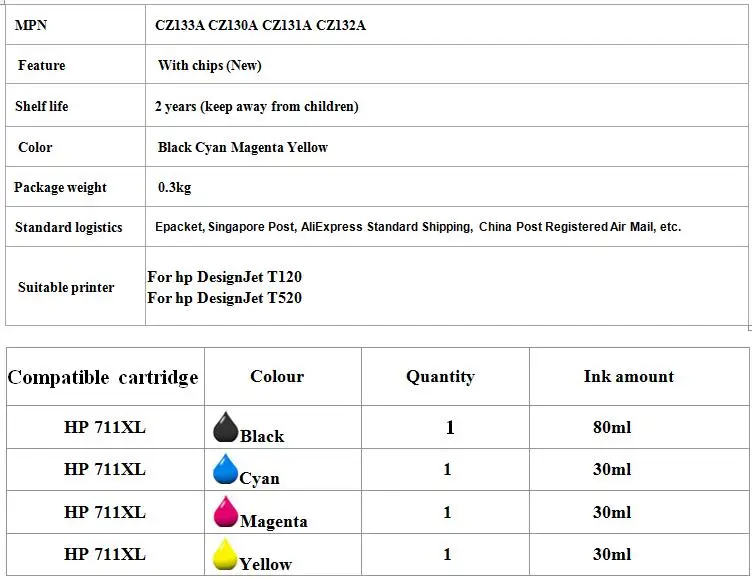 1 комплект совместимых чернил для принтера HP 711 CZ133A CZ130A CZ131A CZ132A HP DesignJet T520 T120