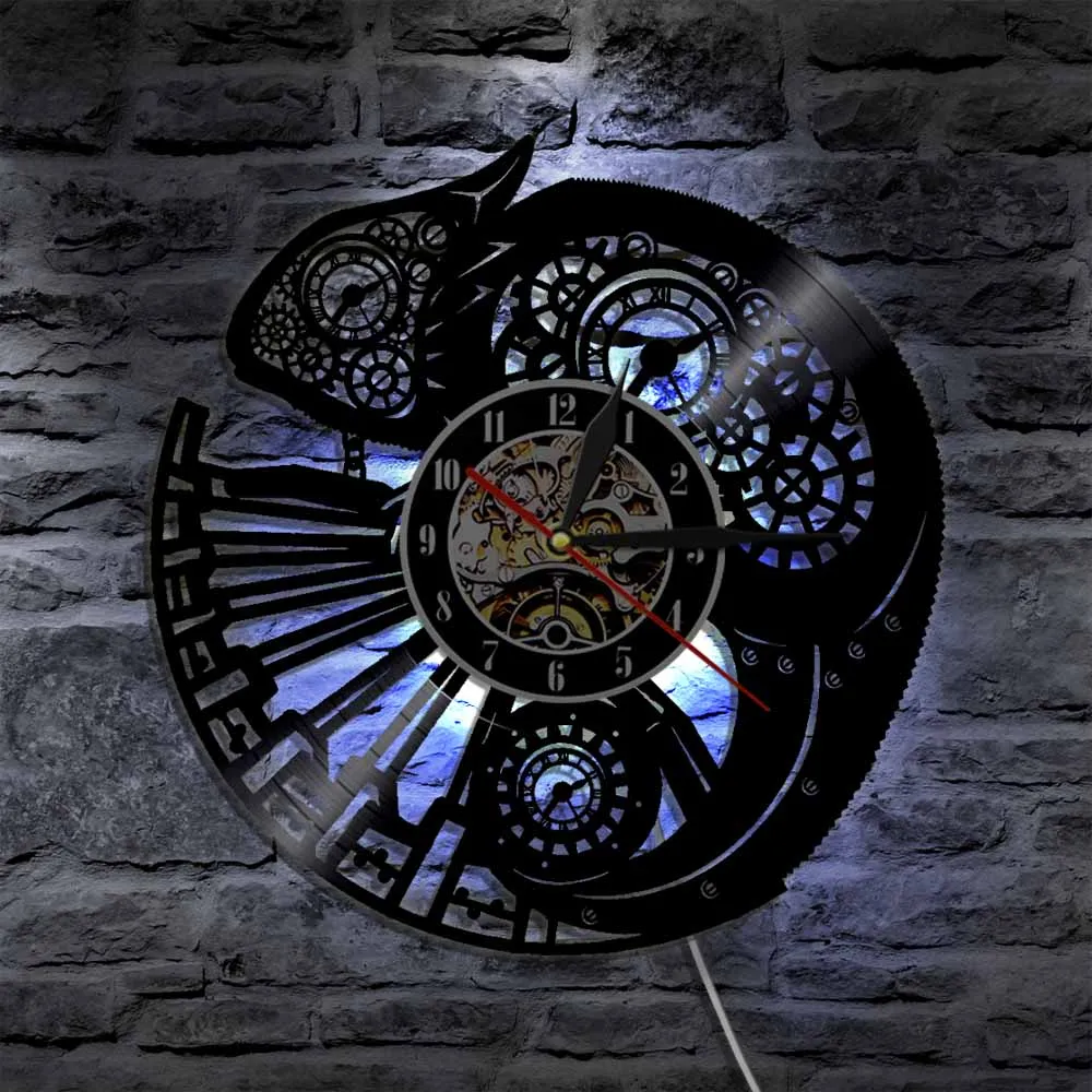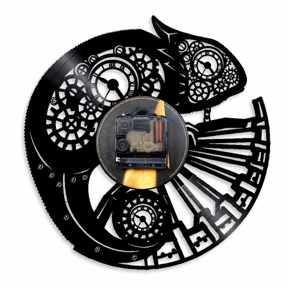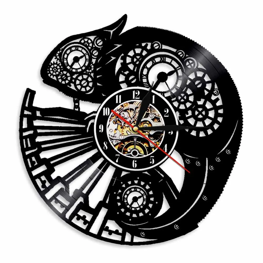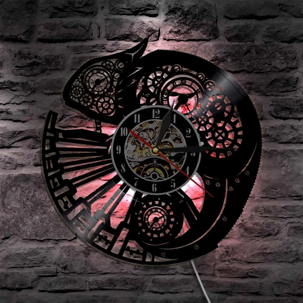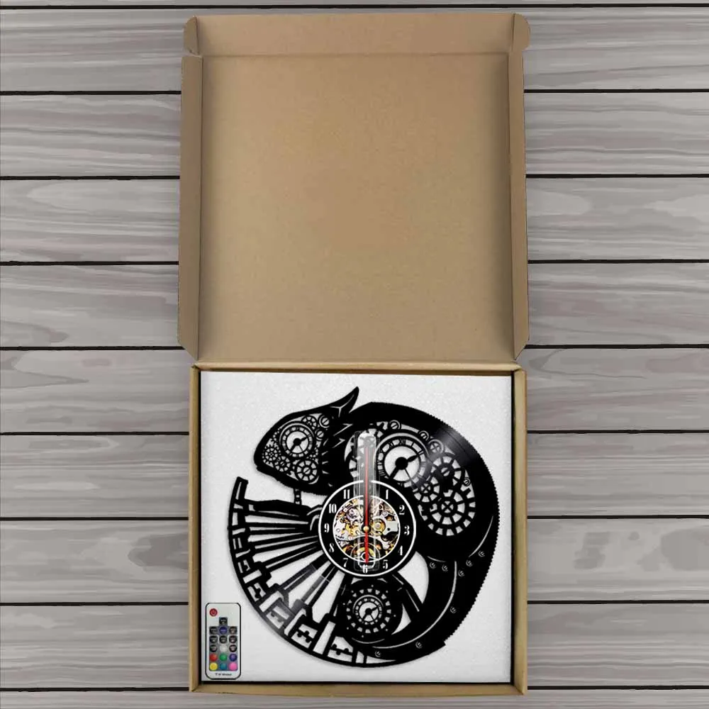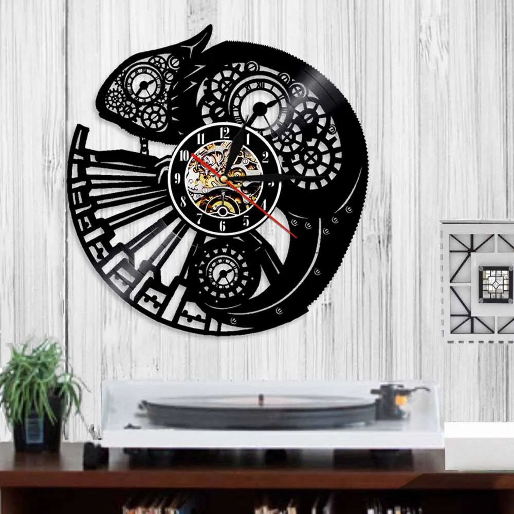 Настенные часы с виниловой пластиной, винтажные светильники в стиле хамелеон, светодиодный ночсветильник, тихие Кварцевые Подарочные часы с животными