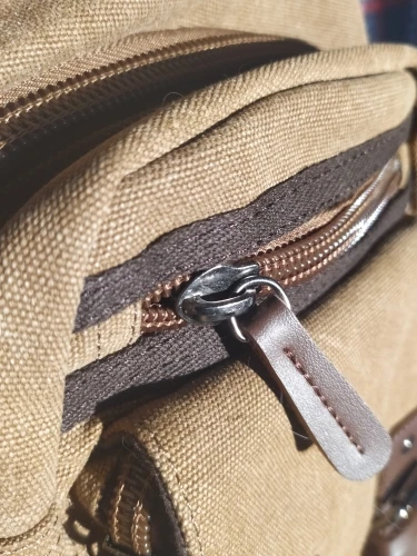 Материал сумки прочный и очень приятный на ощупь. Думала, будет совсем тряпочная, но нет - материал плотный и надёжный. Кожаные застёжки выглядят ненадежно - скорее всего быстро растреплются. Но молнии застегиваются хорошо и выглядят как что-то прочное.