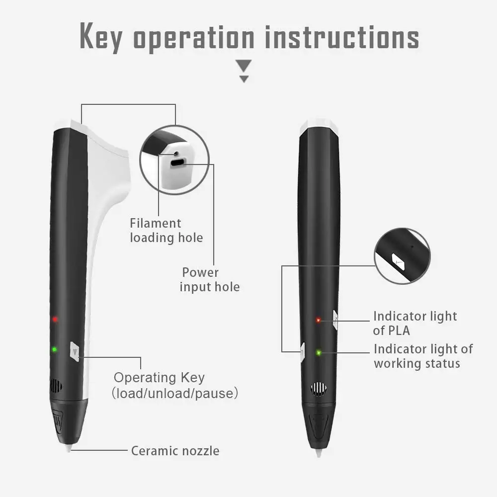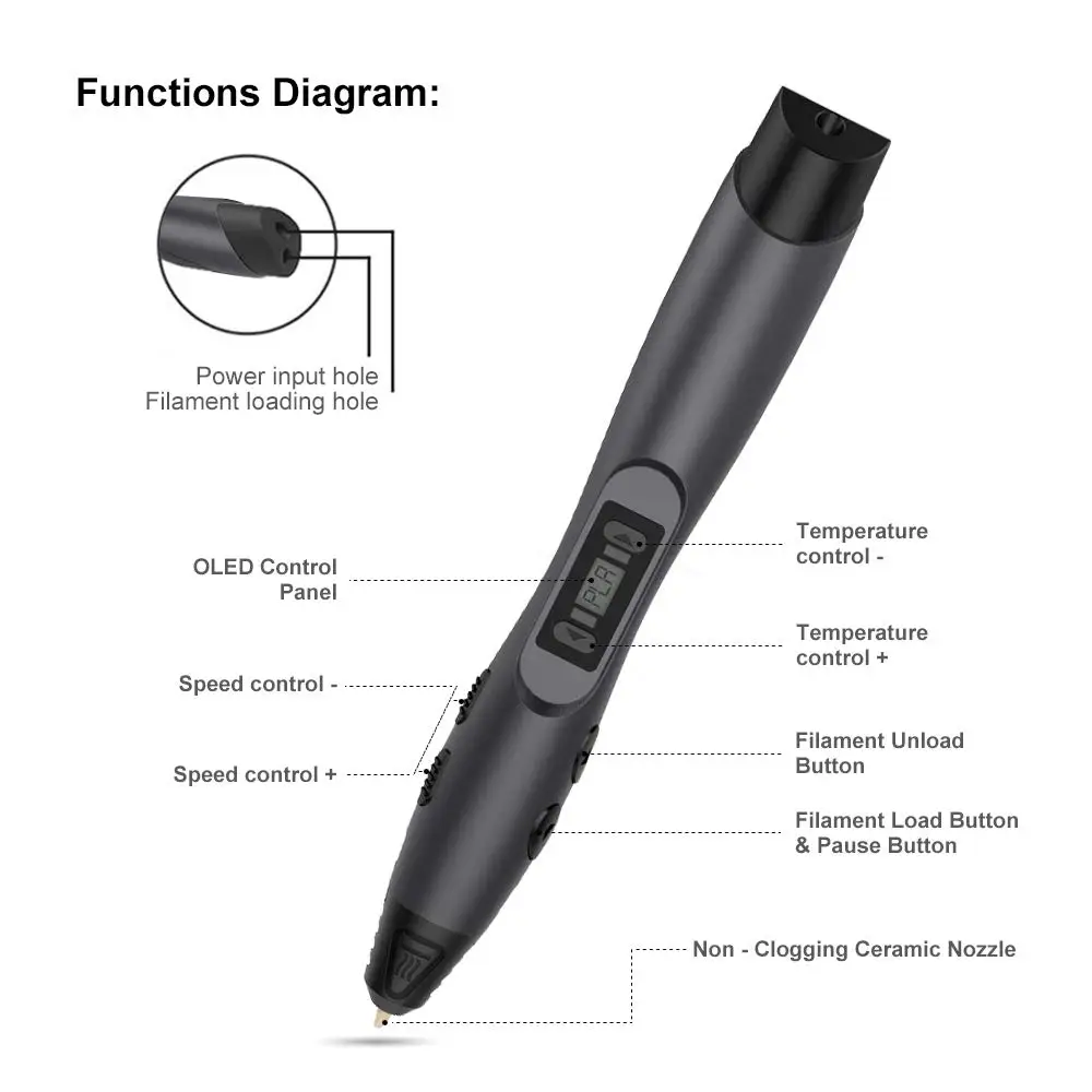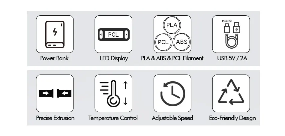 1. Поддержка PLA/ABS/PCL 3D нитей, низкая температура и Общая температура регулируются; 2. Светодиодный экран, возможна смена температуры; 3. Низкая температура PCL нитей, не приводит к ожогам; 4. Восемь цифровых экструдированных рангов по контролю скорости; 5. Порт USB: Внешний внешний аккумулятор доступен. 6. Съемная насадка, без блока. 7. Послепродажное обслуживание: через год после даты доставки, повреждения, вызванные использованием нити с неоригинальным брендом или не строго следуя руководству пользователя, аннулируют гарантию.