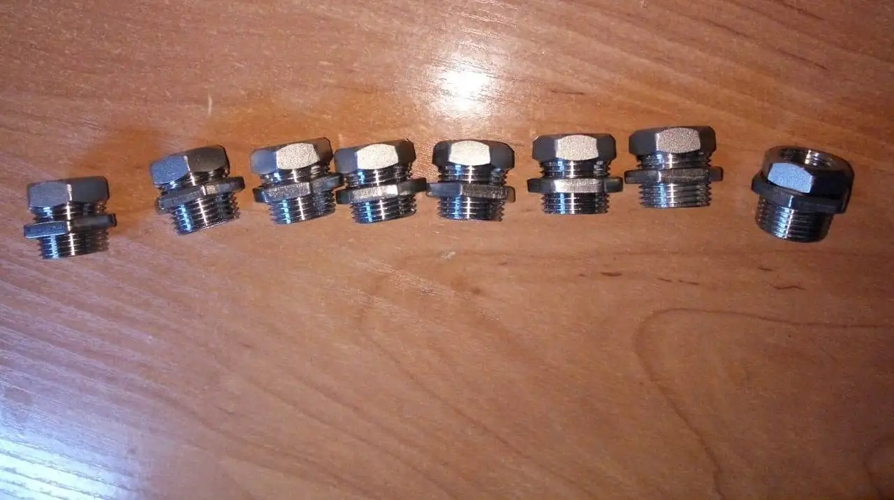 Все 8 гаек магнитятся, следовательно, сделаны не из нержавеющей стали, и будут ржаветь в воде. На штуцера от этого же продавца (3/8-1/4) 7 из 8 гаек на накрутились вообще (см. фото). Как я вижу, с этими гайками - проблемы у многих продавцов, отчего их вместе одним лотом со штуцерами и не продают.