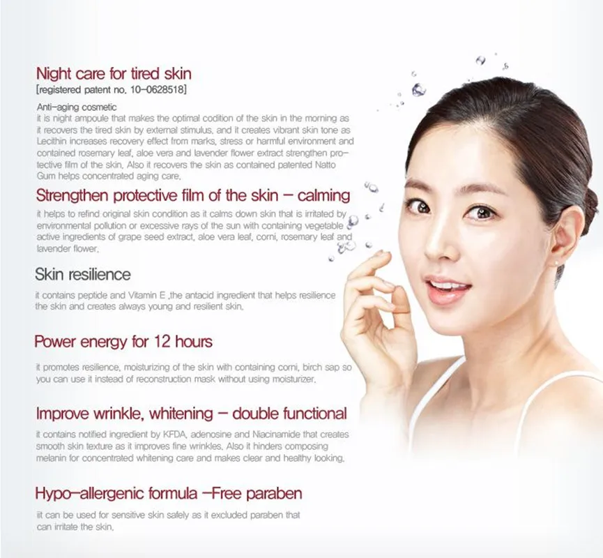 Запатентованная резинка Natto помогает интенсивному омолаживающему веществу восстанавливать кожу. Экстракт листьев розмарина, алоэ вера и лавандового цветка для укрепления защитной пленки для кожи. Лецитин повышает регенерирующую способность от морщин, стресса и вредных сред, чтобы сделать ваш тон кожи Vivid. Это Ночная эксклюзивная регенерирующая ампула, которая извлекает оригинальный статус кожи.