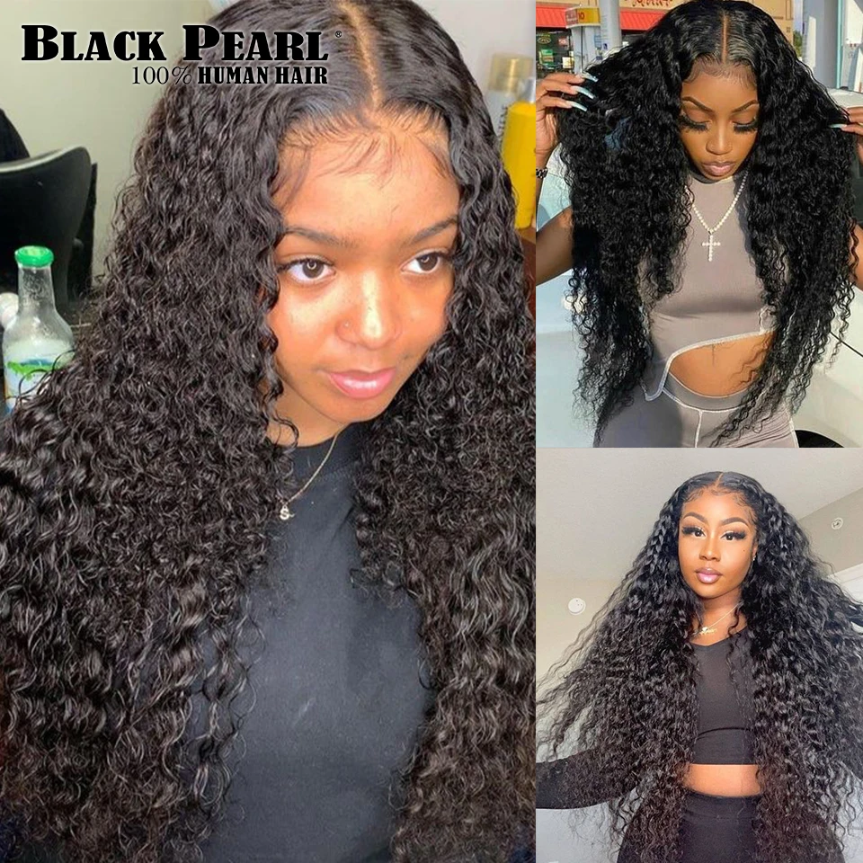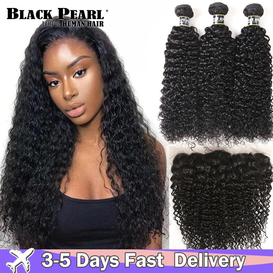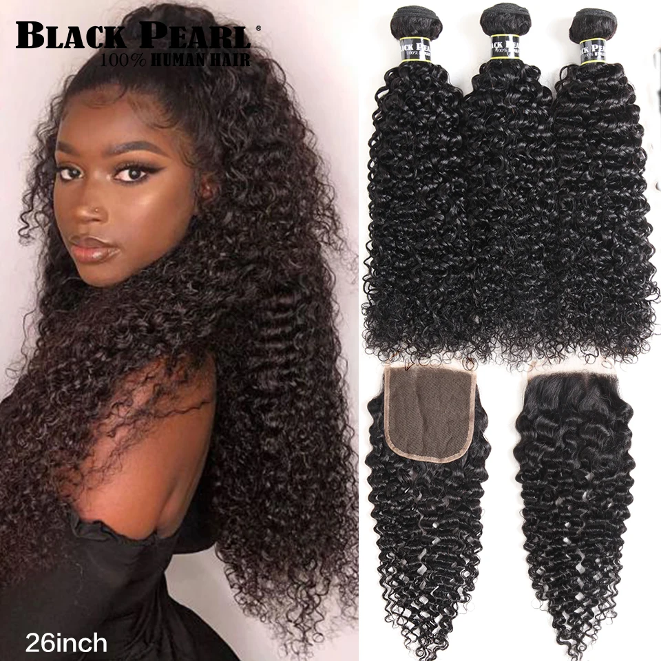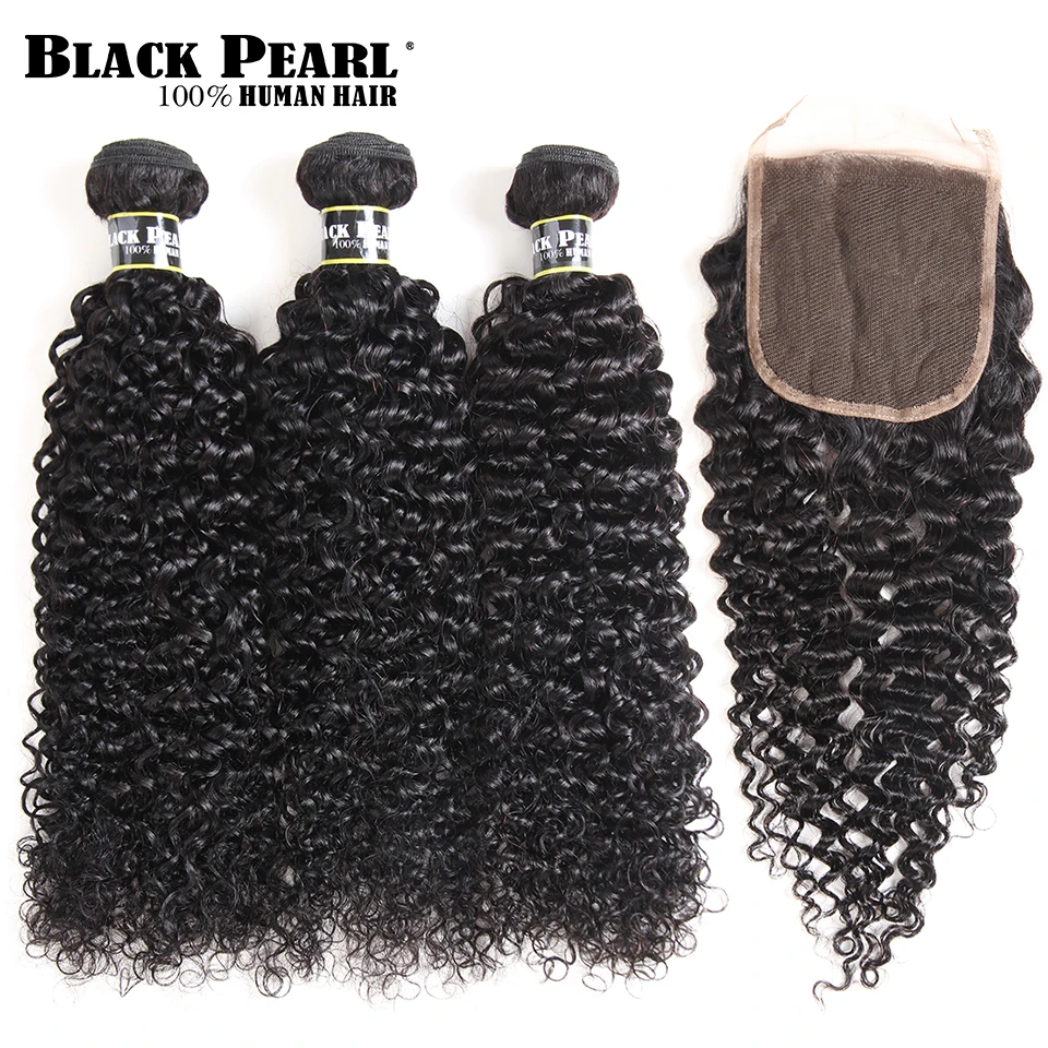 Черные перламутровые кудрявые человеческие волосы 34 пряди с закрытием Remy малазийские кудрявые пряди с закрытием кружева средняя часть закрытие