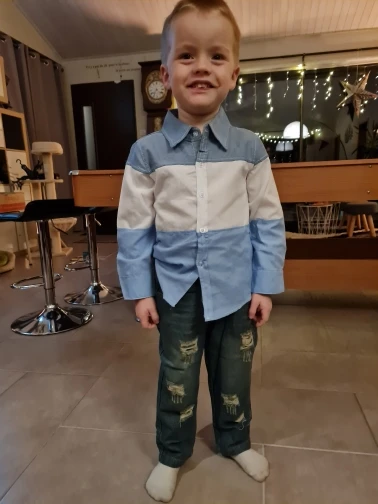 Внука является 5yrs старых и взял возраста, в наличии 6 размеров, для его по-прежнему размер рубашки и куртка приталенная, но брюк немного длиннее для него