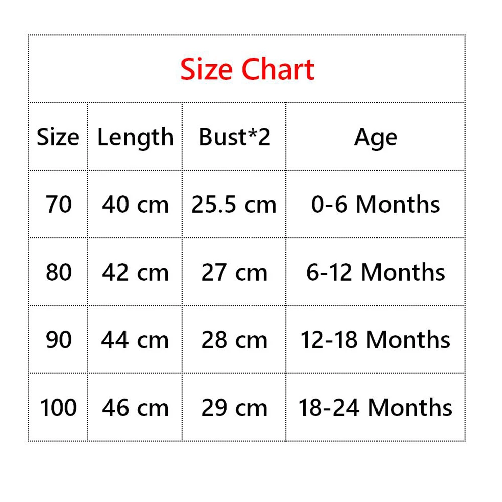 РазмерыДлинаБюст * 2Возраст7040 см25,5 см0-6 месяцев8042 см27 см6-12 месяцев9044 см28 см12-18 месяцев10046 см29 см18-24 месяцевРазница в 2-3% в соответствии с измерениями вручную.Прежде чем купить эту товарную позицию, просим тщательно свериться с таблицей размеров.1 дюйм = 2,54 смОбратите внимание что небольшая разница в цвете считается приемлемой. Это может быть связано с положением источника света и с настройками экрана.