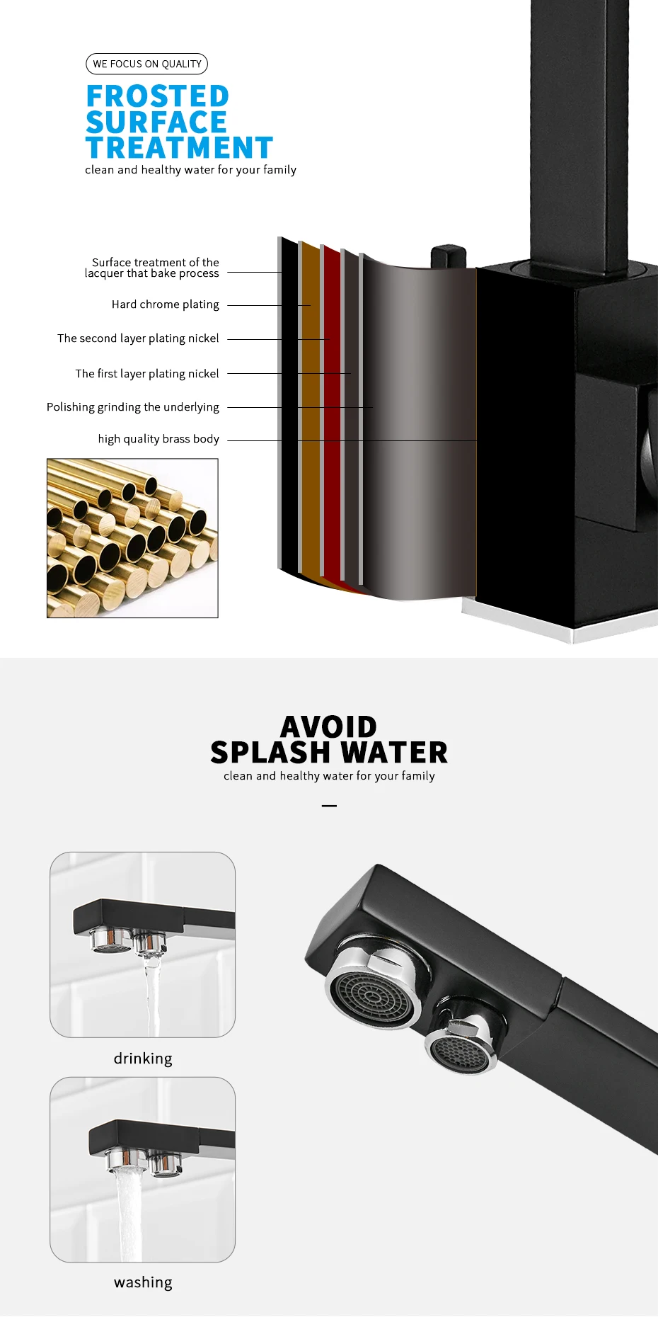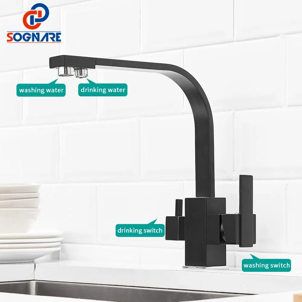 Смеситель для кухни, черный квадратный из прочной латуни, с возможностью поворота на 360 градусов и 3 режимами работы