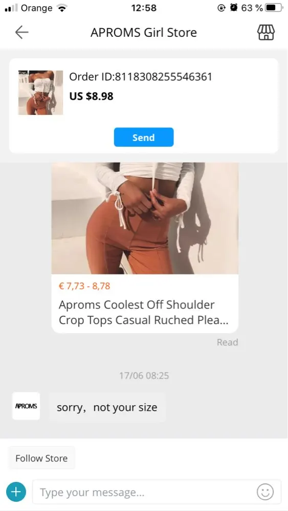Топ очень хороший, но, чтобы быть L, очень маленький, рукава просто поднимают мои руки, а топ немного плотно прилегает к телу, Я не рекомендую его для полных девочек, доставка была быстрой.