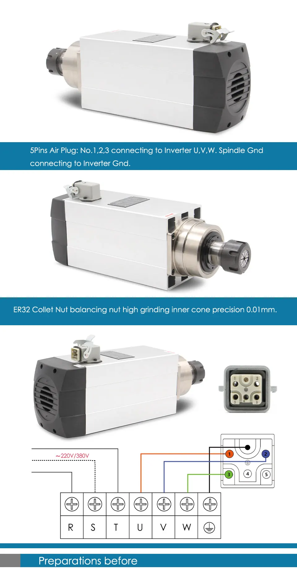 Шпиндель для сохранения и транспортировки, высокоскоростная смазка внутри подшипника изменится, клиенты должны работать на низкой скорости в течение 30 минут. 3000 об/мин, а затем следуйте за плохим увеличением, пробежите по 20 минут каждый. Шпиндель и инвертор должны работать вместе. Характеристики и параметры инвертора должны соответствовать параметрам шпинделей.