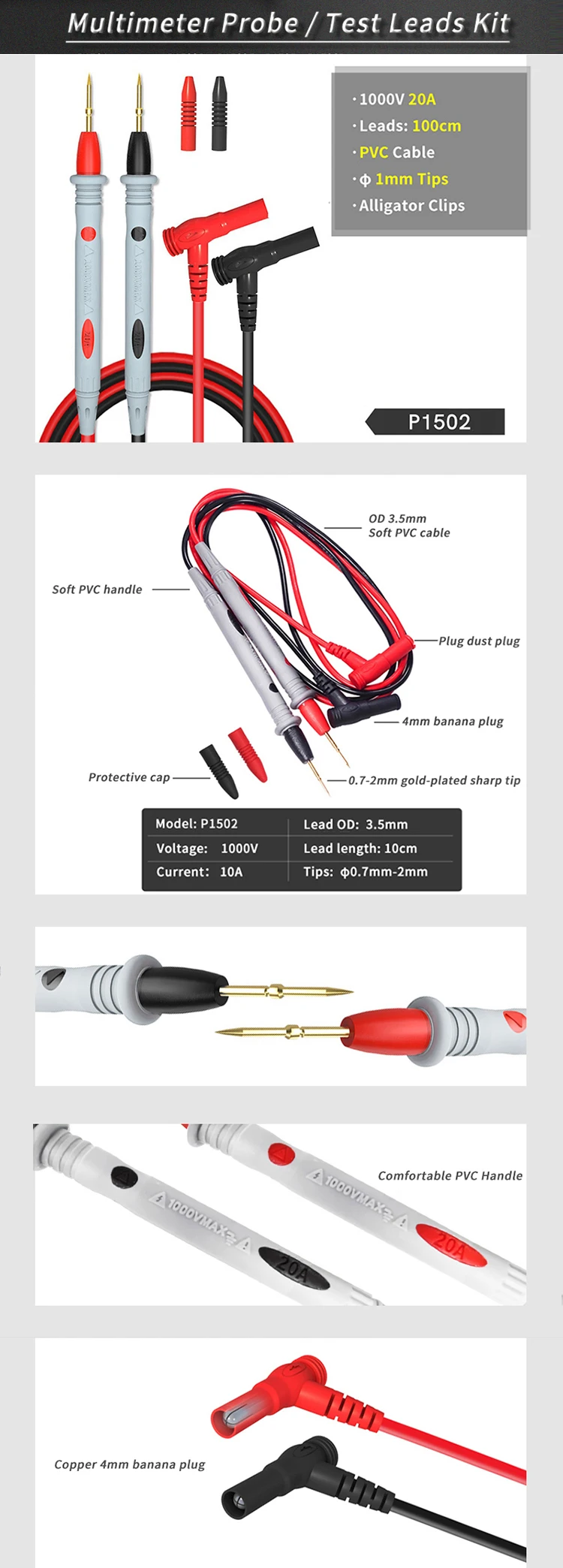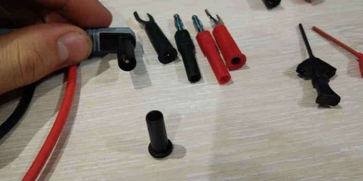 Доставка 10 дней. Соответствует описанию. Отрезал пластмассовое колечко на 2 мм , что бы вставить провода в мультиметр. Зашли очень плотно.
