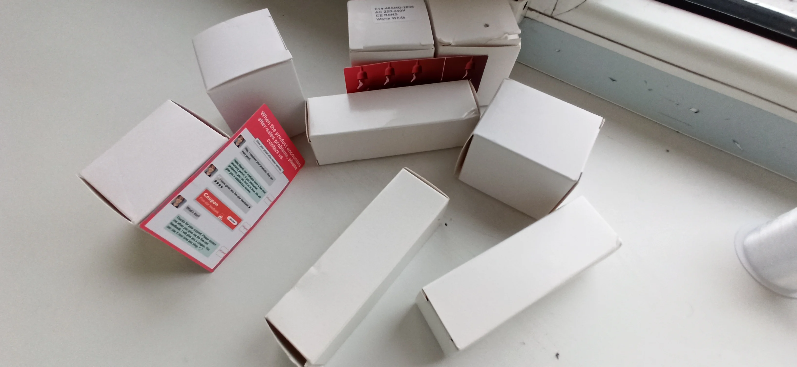 Доставка неделю с отслеживанием. Упаковано было хорошо, все в коробочках. Все соответствует заказу. Теплый белый прям белый, а не желтоватый как мы привыкли. Но в синеву не отдает. Продавцу спасибо за акцию.