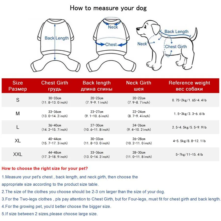 1. Сначала измерьте грудь вашего питомца, длину спины и окружность шеи, а затем выберите подходящий размер в соответствии с таблицей размеров изделия.2. Во-вторых, размер одежды, которую вы выберете, должен быть на 2-3 см больше, чем размер вашей собаки.3.Для двух ног, пожалуйста, обратите внимание на обхват груди, и для четырех ног, должны соответствовать обхвату груди и длине спины.4. Для растущего питомца вам/лучше выбрать больший размер.5. Если размер между 2 размерами, пожалуйста, выберите большой размер.Размер:S M L XL XXL(Просим учесть допустимую погрешность в 1-2 см, связанная с особенностями ввиду того, что Замеры производились вручную, спасибо (все размеры указаны в см, обратите внимание: 1 см = 0,39 дюйма)Примечание:Рекомендуемый вес-это только ссылка, а не основа. Вам все еще нужно измерить размер вашего питомца перед покупкой