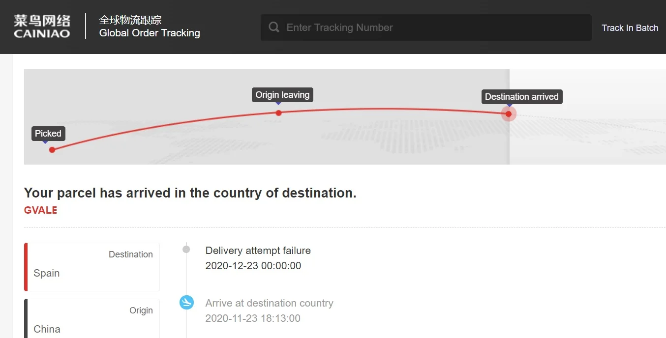 Заказ в конце ноября. В отслеживании указано, что они пробовали доставить его мне в конце декабря, и доставка не прошла. Ваш код не отслеживается в Испании correos. Служба защиты покупателя была бесполезна. Я потерял продукт и деньги. Я подумаю об этом перед покупкой снова.