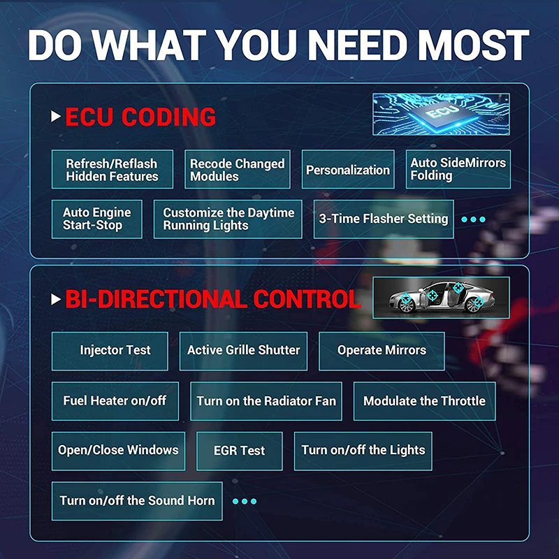 С помощью Active Test этого диагностического инструмента вы можете вывести команду в блок управления двигателем, чтобы включить / выключить приводы и легко найти неисправности в подсистемах вашего автомобиля, не используя управление автомобилем:[Включите вентилятор радиатора | Регулируйте дроссель | Открыть / закрыть окна | Управляйте зеркалами | Включение / выключение света | Включение / выключение звукового сигнала | Проверить дверной замок…]