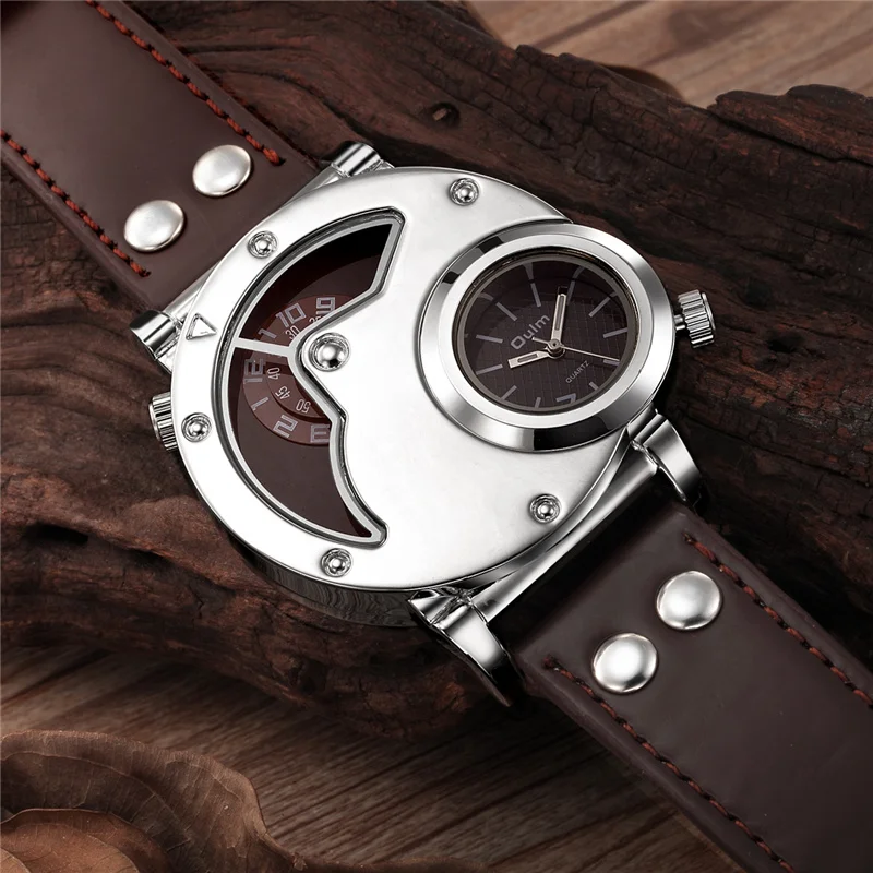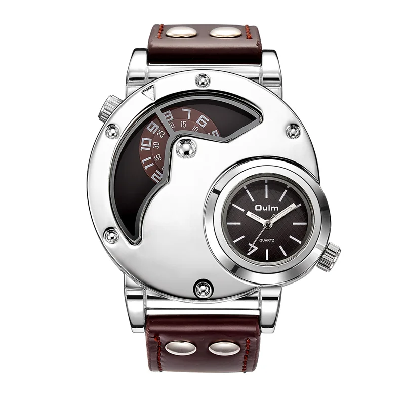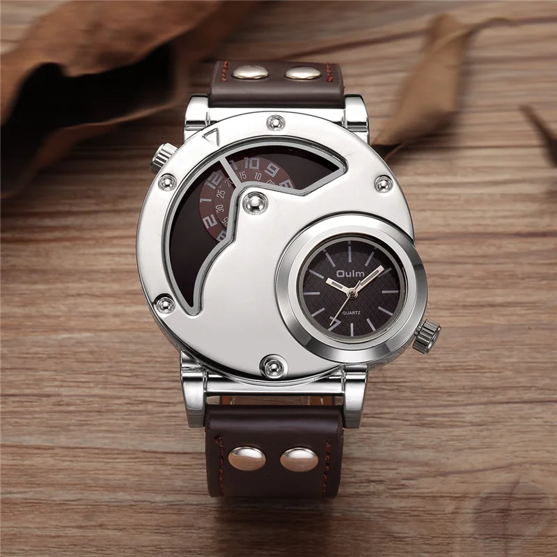 Мужские кварцевые часы Oulm, роскошные Серебристые наручные часы, военные спортивные наручные часы с двумя часовыми поясами, мужские часы