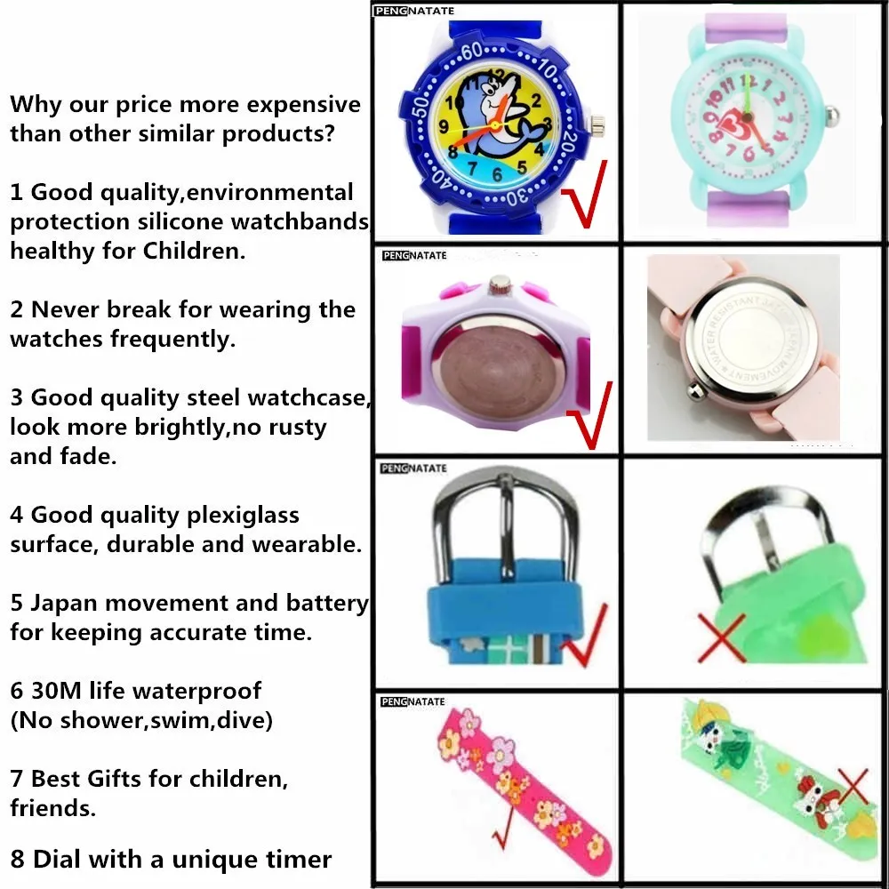 Почему наша цена дороже, чем другие аналогичные товары1. Хорошее качество, безопасные для окружающей среды силиконовые ремешки для часов, безопасные для детей.2 никогда не ломаются, чтобы носить часы часто.3. Экологически безопасный пластиковый корпус часов, выглядит более ярко.4. Высококачественная поверхность из оргстекла, прочная и износостойкая.5 японский механизм и аккумулятор для сохранения точного времени.Водонепроницаемость 6 30 м (без душа, плавания, погружения)7 лучших подарков для детей и друзей.