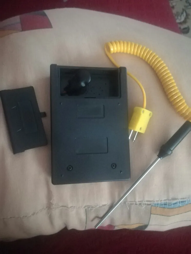 Доставка в МО за 10 дней. Датчики разные. Проволочный показывает побыстрее. Датчик с наконечником нужно приставлять при замере торцом. Показания то увеличиваются, то уменьшаются. На фото сравнение температуры станции и прибора. Где точнее сказать не могу. Пробовал откалибровать паяльную станцию, вроде получилось. Обязательно соблюдать полярность вилки датчика. Работает от кроны, в комплекте нет.