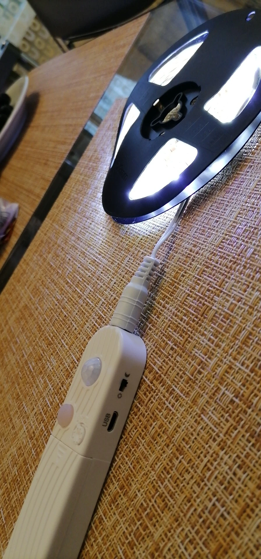 отличная вещь. свет яркий, датчик работает, есть возможность настроить время свечения от 5с и далее. работает от 4х батареек ААА либо кабель usb-b . к блоку идёт двусторонний скотч 3м, держится крепко. сама лента клеится легко и крепко.