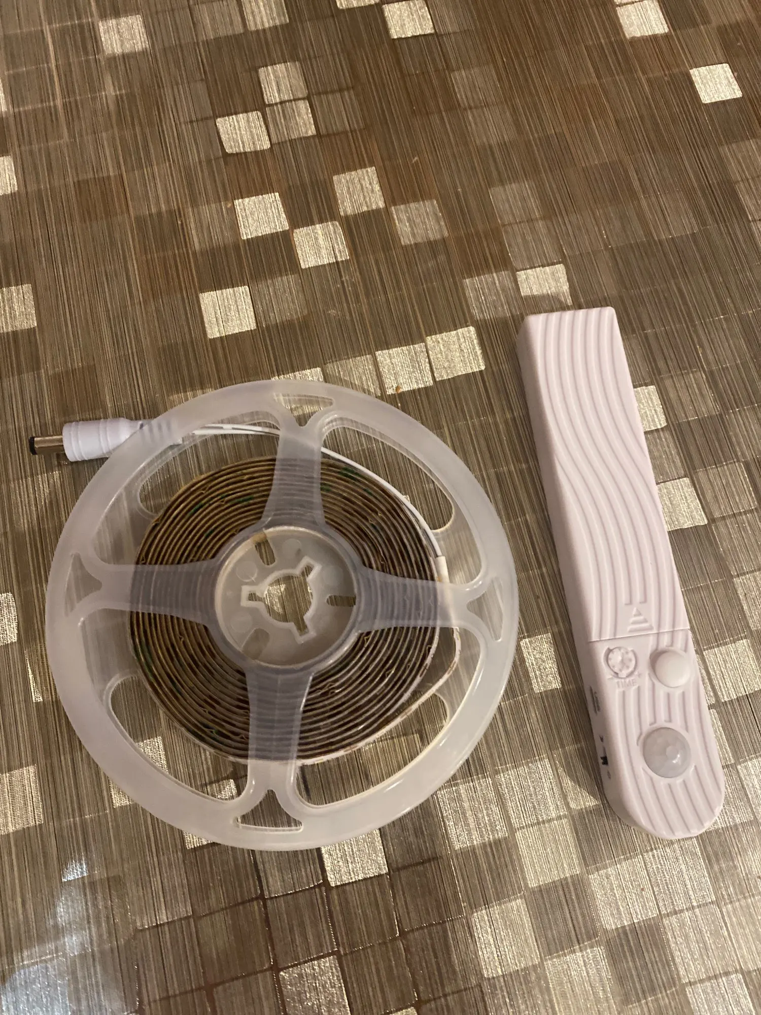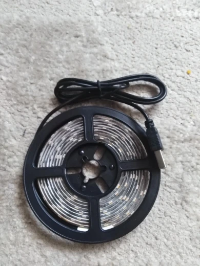 Заказывал "теплый белый" с датчиком движения, на 3 м за 614 руб. Получил в ближайшем отделении почты на 14-й день. Сначала прихватил бумажным скотчем, чтобы учесть длину и изгиб над плитой. Потом все приклеил, качество на пятёрку. Супруга счастлива. "Теплый белый" это конечно не жёлтый как лампы накаливания, придаёт немного строгости обстановке на кухне. Датчик работает хорошо. Самое крутое - в блоке питания есть micro-USB вход, благодаря чему я избавился от мороки с батарейками (см. фото)