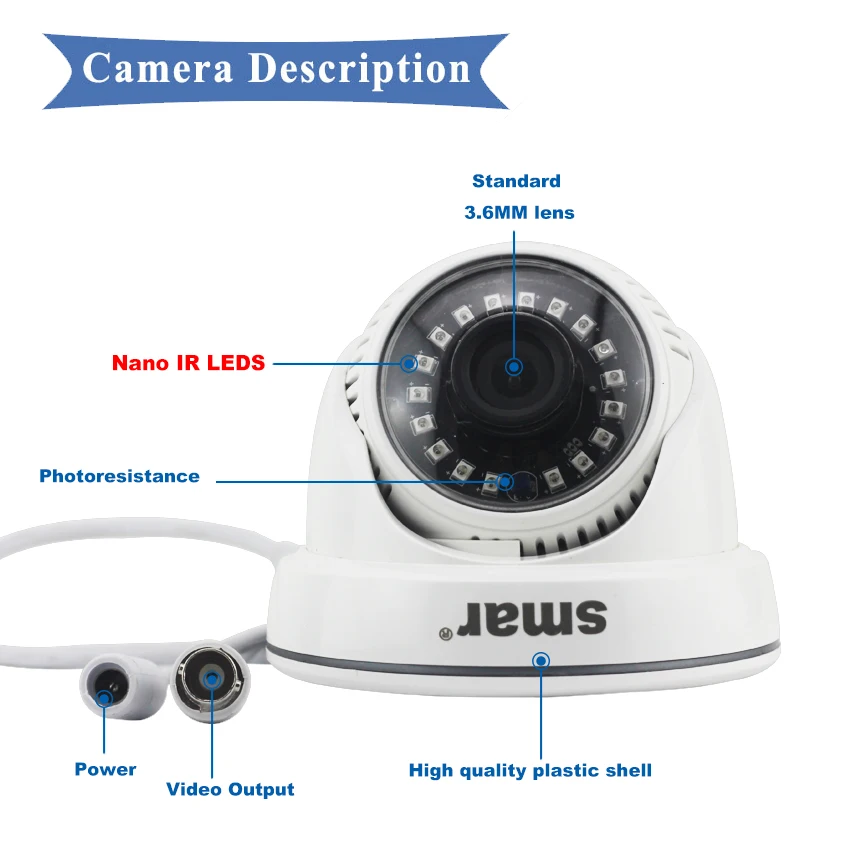 1.1/3 дюйма SC3035 CMOS 2.PAL/NTSC : 2048*1536/ 2560*1440 3.18 Нано ИК светодиодов 12mil 4. Встроенный IR-CUT фильтр5. Дневное и ночное видение6. Используется только в помещении7. Высококачественный АБС-пластикМатериал.8. Стандартный объектив: объектив HD 3,6 мм (объектив 6 мм опционально), если вам нужны другие линзы, пожалуйста, оставьте нам сообщение в вашем заказе.9. AHD (аналог высокой четкости), новый формат видео для улучшенной CVBS (КОМЕТА *) и HD передачи видео.10. HD AHD камера является стандартом передачи аналогового HD видео с помощью коаксиального кабеля, что позволяет передавать HD на большие расстояния по более низкой цене, чтобы удовлетворить требования к сложной и большой установке.11. Обычно используется коаксиальный кабель, SYV-75-5 кабель может передавать видео более 500 метров. 12. Должен работать с 4MP/3MP AHD DVR, который поддерживает режим AHD-H/AHDNH!13. Лучший выбор для восстановления проекта.14. Вы можете обновить старую аналоговую систему безопасности до 2.0MP HD камер без изменения кабелей.