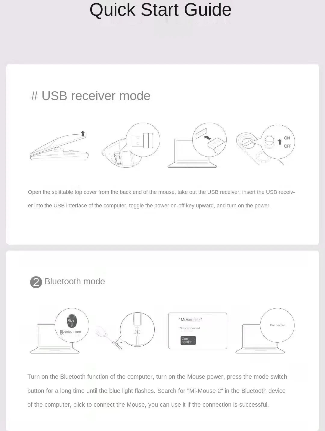 получил мышь, упаковано супер. приятная на ощупь и внешний вид. по usb подключилась сразу, по блютузу пришлось повозиться. уже думал что брак, написал продавцу. но оказывается нужно не просто переключить режим, но и потом задержать кнопку и появляется) спасибо продавцу за быструю доставку ,советую к покупке!