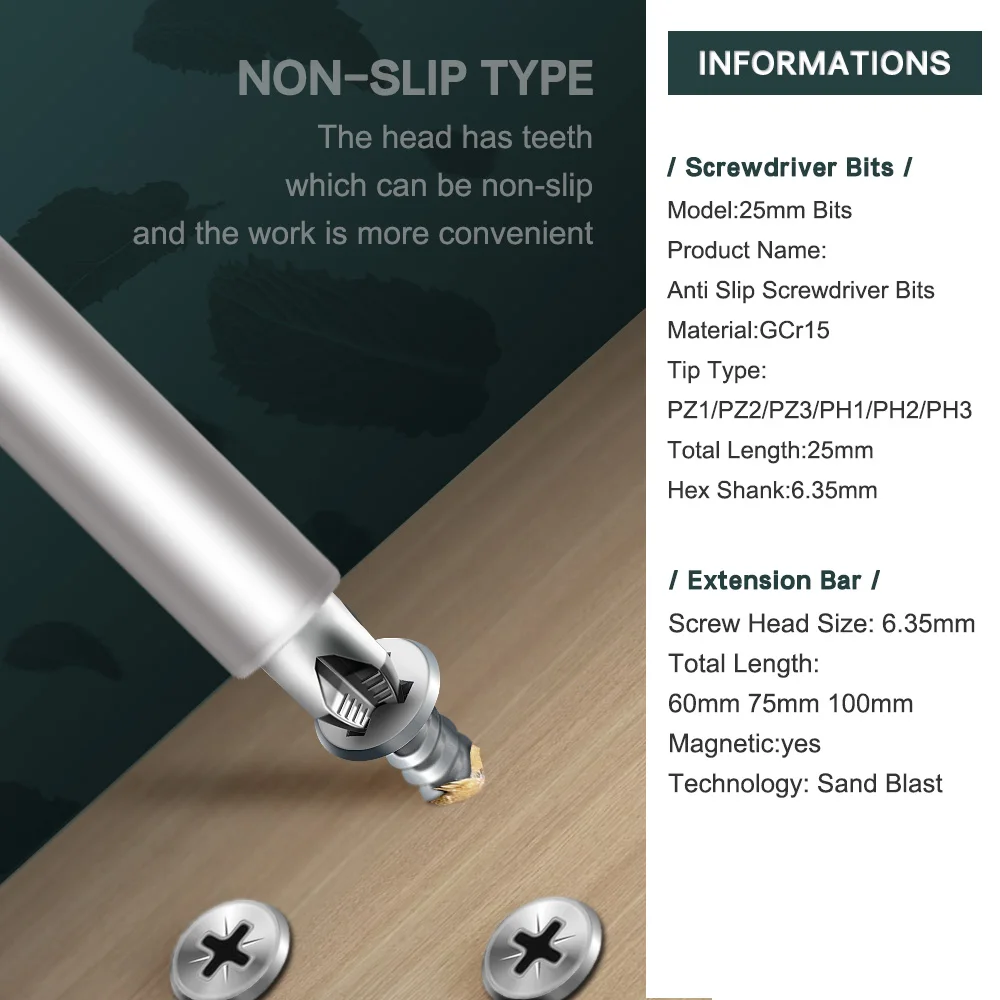 Продукт точно соответствует описанию. Стандартное качество, отличная цена, хороший выбор. Это мой 3-й заказ для бит. Быстрая доставка. Я доволен. Теперь мне нужны насадки torx, я буду покупать.