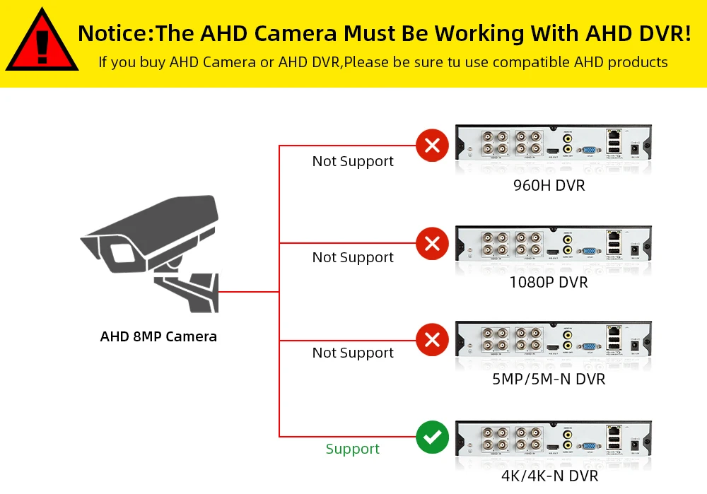 Это камера Super HD 4K, для работы необходимо использовать 4K-N AHD DVR ,4K AHD DVR!, Если нет, камера 4K AHD не работает.Нельзя использовать "AHD 5MP System" "AHD 4MP System" "AHD 4M-N System" и "AHD-H 1080P System","Система AHD 1080N" и "система AHD AHD-M 720P""AHD DVR или" Common DVR ", камера 4K AHD не работает!1.HD 4K AHD камера работает только в режиме реального 5MP AHD DVR или 4K-N AHD DVR или 4K AHD DVR! Пожалуйста, убедитесь, что ваш AHD DVR поддерживает 4K HD камеру перед покупкой!2. Если вы хотите купить видеорегистратор 4K AHD, пожалуйста, проверьте мой магазин 4K AHD DVR Recorder group снова. Спасибо!3, эта камера 4K AHD поддерживает запись лица человека, обнаружение лица и воспроизведение лица, если вам нужна эта функция, необходимо только подключение распознавания лица AHD DVR, распознавание лица будет работать нормально!