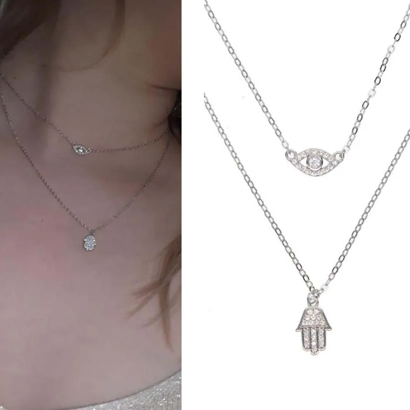 2021 одежда высшего качества 925 стерлингового серебра с многослойным покрытием хамса руки с клипсами Дурной глаз Boho двойная цепь ожерелье нежный Ювелирное Украшение с качественным фианитом свадебный подарок