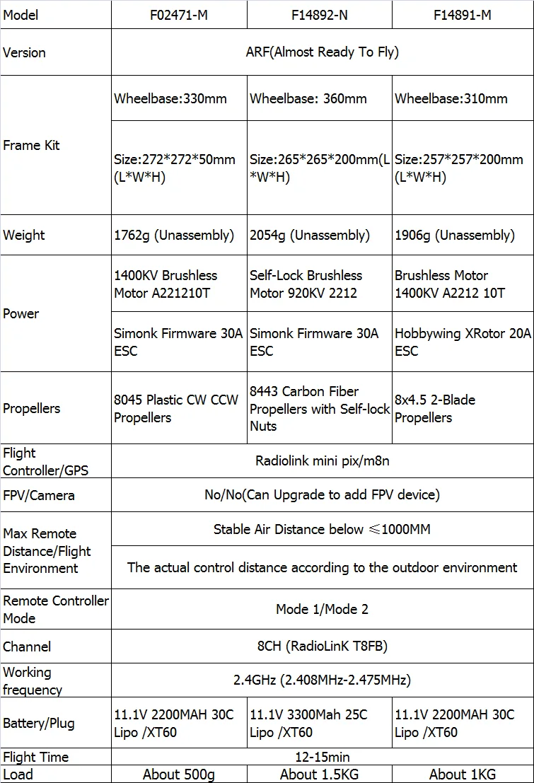 Профессиональный JMT 2,4G 8CH 310 330 360 Мини RC Квадрокоптер ARF RTF разборка DIY Дрон FPV обновляемый с Radiolink Mini PIX M8N GPS удержание высотыПосылкаF02471-M F330 Квадрокоптер:Комплект рамы F330 * 1,1400KV A2212 10T бесщеточный двигатель * 4,Прошивка Simonk 30A ESC с BEC 5V * 4,8045 пластиковые пропеллеры CW CCW * 2,Radiolink MINI PIX + MINI GPS * 1,Складное крепление для антенны GPS * 1,Пульт дистанционного управления Radiolink T8FB * 1,11,1 V 2200MAH 25C Lipo аккумулятор * 1,Зарядное устройство B3PRO * 1,Звуковой сигнал * 1,Сумка для аксессуаров * 1