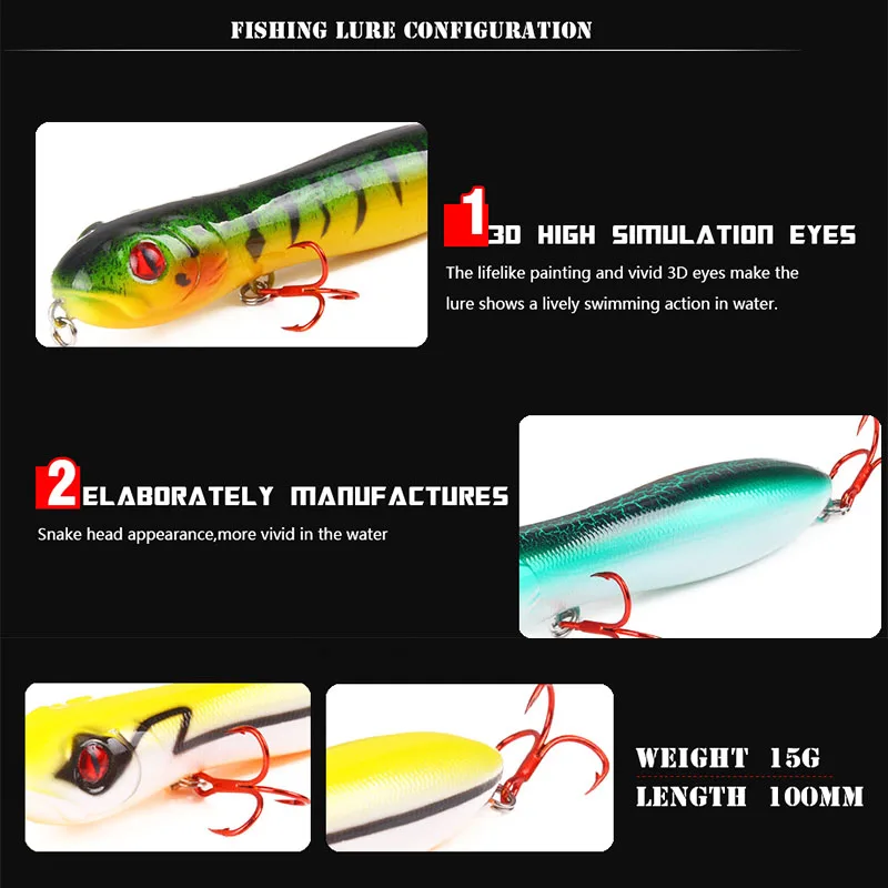 Приманка Topwater для рыбалки, 1 шт., 10 см, 15 г, воблер карандаш, голова змеи, Поппер, искусственная пластиковая жесткая приманка, кренкбейт для ловли окуня и щуки, Снасть